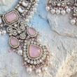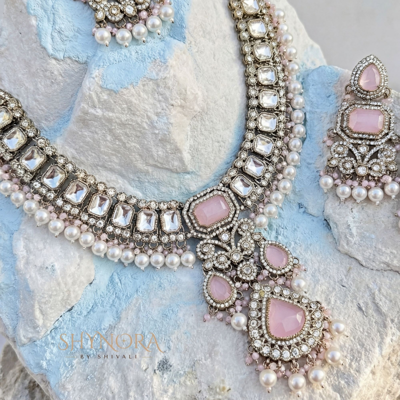 The Gulnaar Rose Pearl Kundan Bridal Set is a celebration of delicate femininity and regal craftsmanship. Designed with soft rose-pink stones, radiant Kundan & American Diamond detailing, and finished with graceful pearl drops, this set exudes timeless bridal elegance.