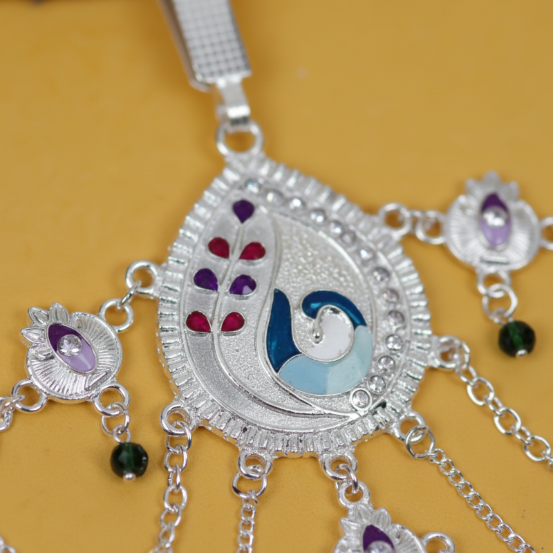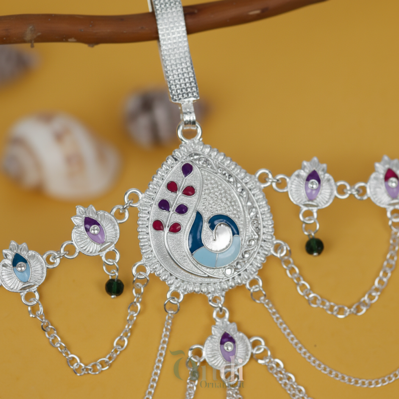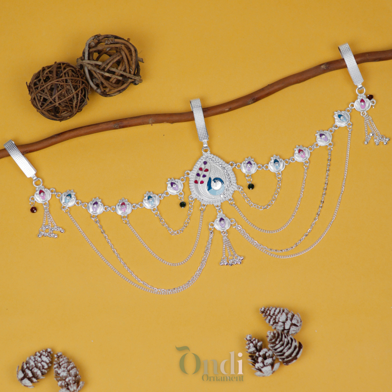 This elegant oxidised kamarbandh features a beautifully crafted swan motif centerpiece highlighted with soft multicolor enamel detailing. The waistline is decorated with a series of delicate lotus-shaped motifs, each accented with pastel enamel colors that add charm and vibrancy. Multiple cascading chains drape gracefully across the waist, creating a stylish layered effect. Tiny ghungroo-style danglers enhance the overall elegance and movement, making this kamarbandh a perfect accessory for sarees, lehengas, and festive ethnic outfits.