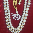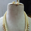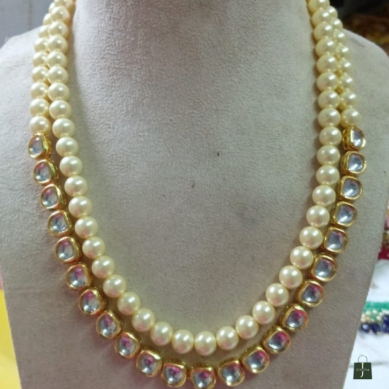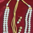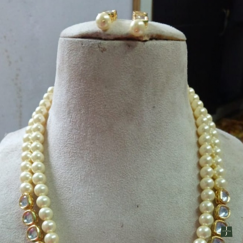 This is a classic double-strand of semi precious pearl and kundan necklace set with matching stud earrings, designed in a timeless traditional style.