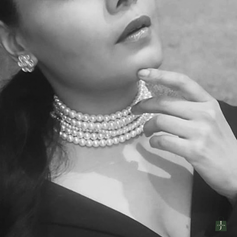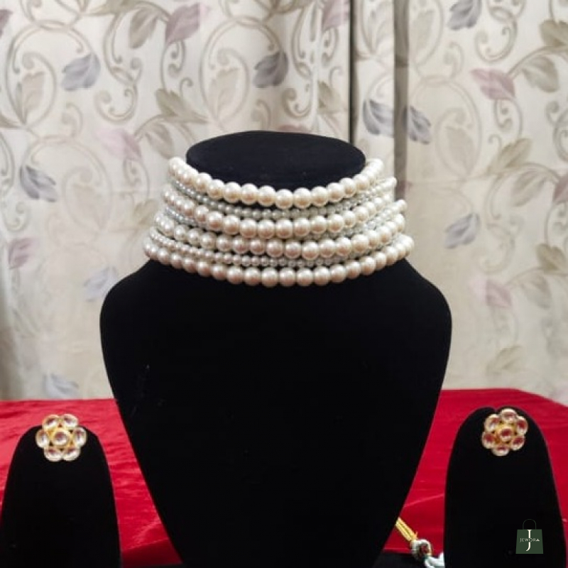 This is a classic pearl choker set with a rich, traditional bridal vibe.The choker features multiple vertical strands of creamy white pearls, beautifully arranged to create a bold yet elegant statement. The pearls are framed with gold-tone bars on both ends, finished with delicate detailing that adds a royal touch. The adjustable gold dori (tie-up) closure makes it comfortable and easy to fit, while also giving it a traditional handcrafted look.The set comes with matching stud earrings, designed with clustered white kundan stones in a floral pattern, perfectly complementing the choker without overpowering it.