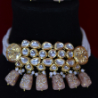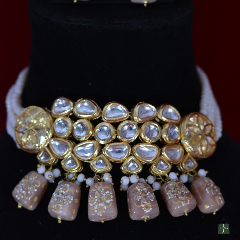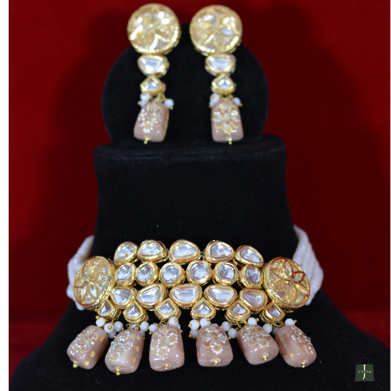 This Handcrafted Kundan Choker Set showcases elegant beige drops paired with luminous Kundan stones and refined gold polish. The soft color palette adds sophistication, making it perfect for bridal wear and festive outfits while delivering a high-end look that remains comfortable, wearable, and affordably priced.