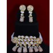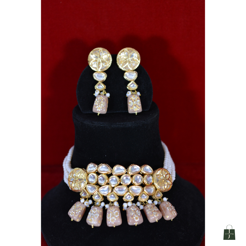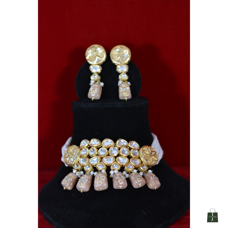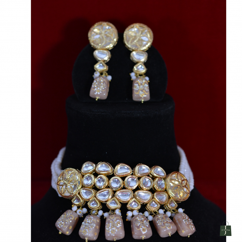 Handcrafted Kundan Choker Set With Beige Drops And Gold Polish