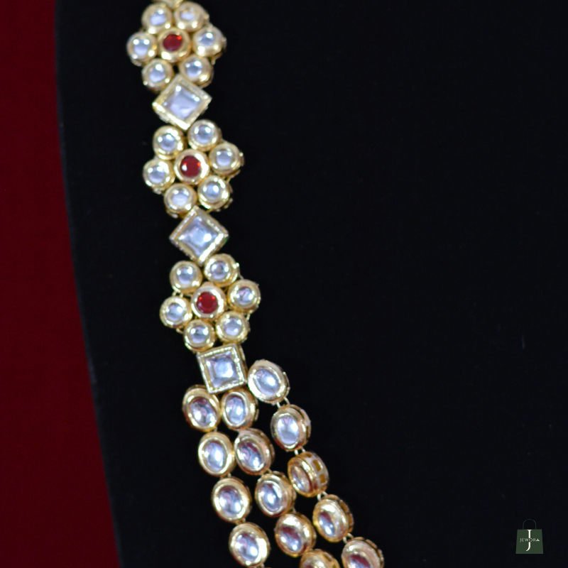 Featuring multiple strands of finely set Kundan stones, this handcrafted necklace set offers layered elegance and graceful movement. The matching earrings complete the look, making it perfect for weddings and celebrations while delivering a premium visual impact that remains lightweight, comfortable, and value-focused.