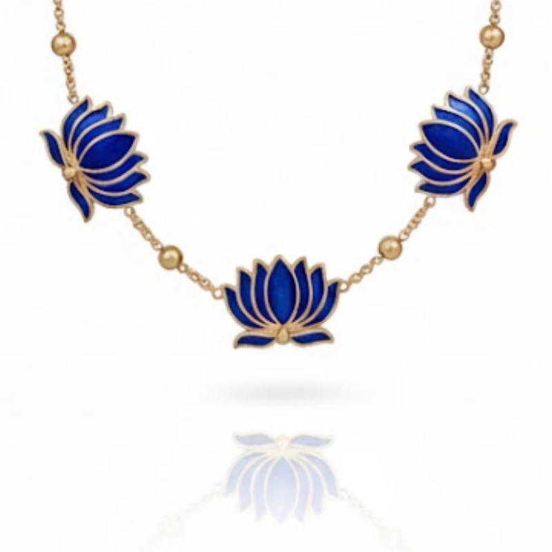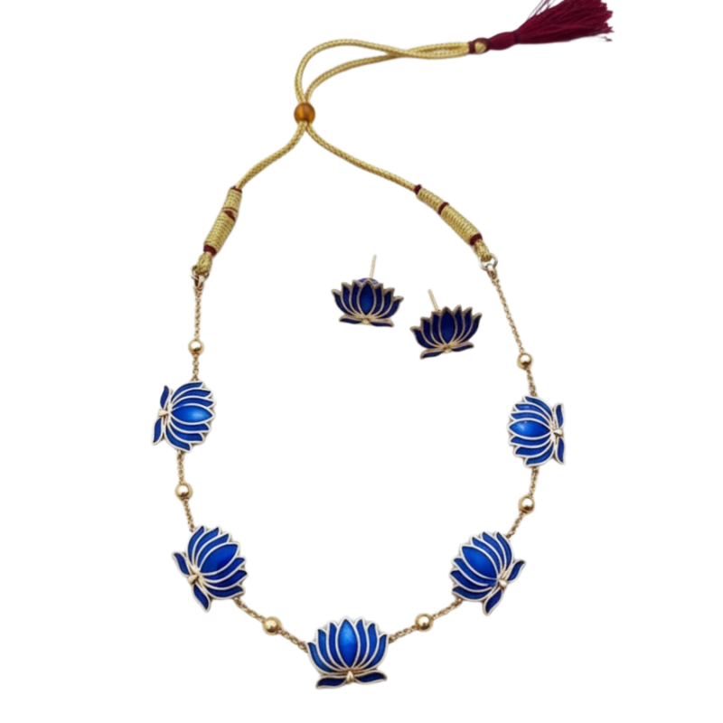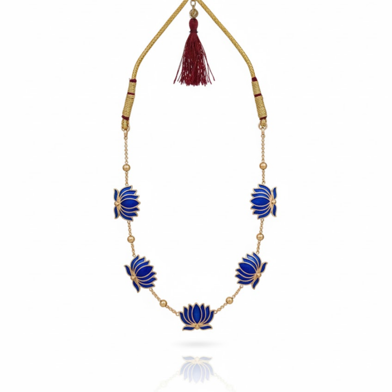 Add a touch of tradition and grace to your look with this stunning handcrafted lotus design necklace. The delicate dark blue enamel lotus motifs beautifully symbolise purity and elegance, while the adjustable golden dori adds a traditional charm. Perfect for festive occasions, weddings, or ethnic celebrations, this necklace effortlessly blends heritage with style.