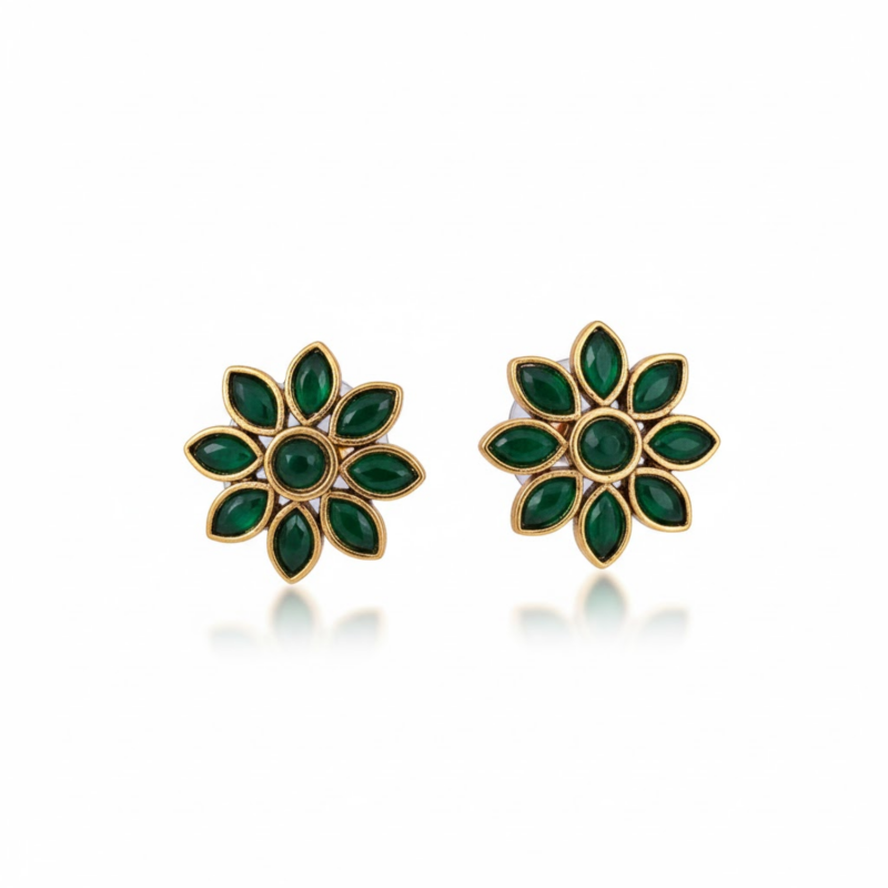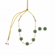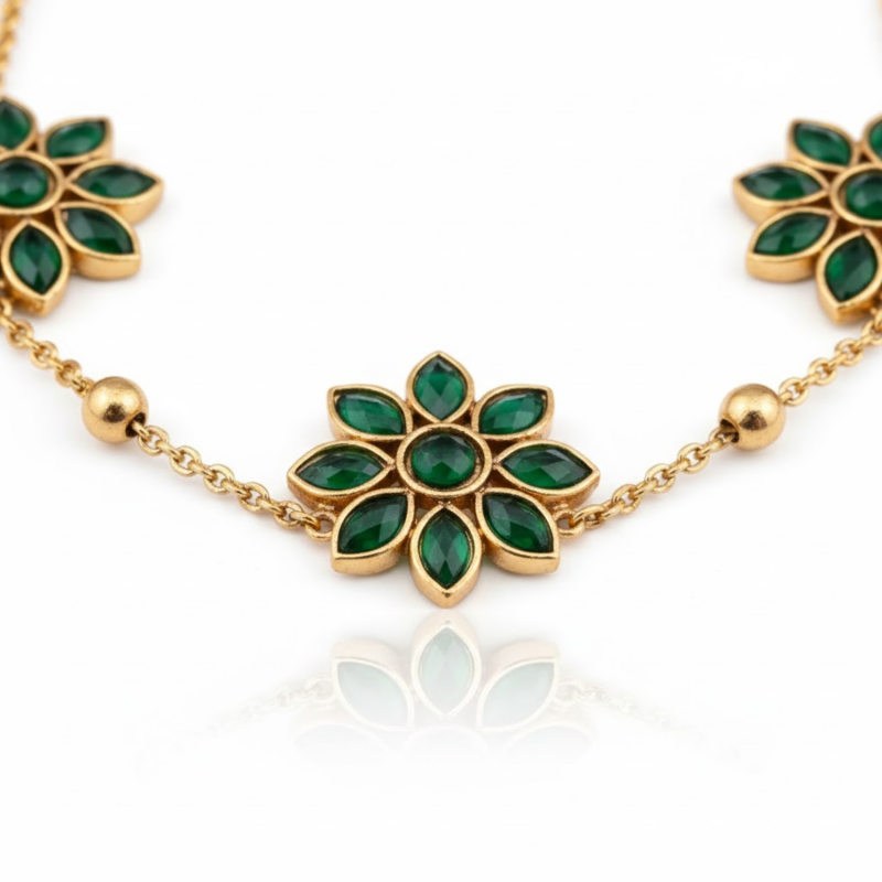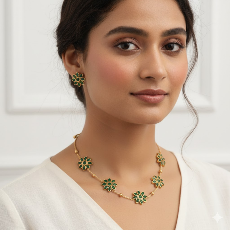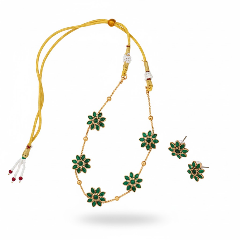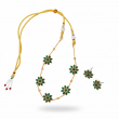 Elegant and timeless, this handcrafted Lotus Petal Necklace Set captures the beauty of traditional Indian artistry. Adorned with delicate green enamel petals, each motif reflects a sense of serenity and charm. The golden thread dori gives it an adjustable fit and an ethnic touch, making it a perfect companion for festive wear, weddings, and cultural events. Lightweight, graceful, and vibrant — this set is designed to make you bloom beautifully.
