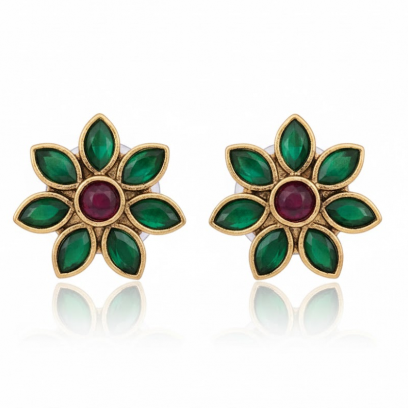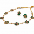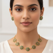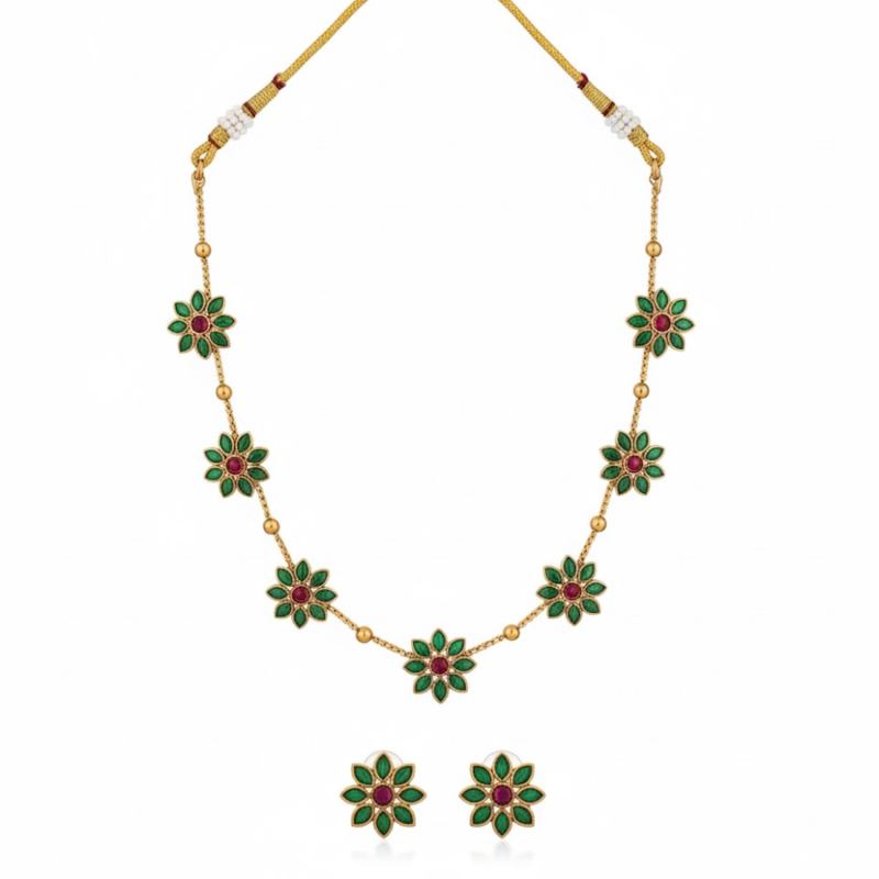Elegant and timeless, this handcrafted Lotus Petal Necklace Set captures the beauty of traditional Indian artistry. Adorned with delicate green and red enamel petals, each motif reflects a sense of serenity and charm. The golden thread dori gives it an adjustable fit and an ethnic touch, making it a perfect companion for festive wear, weddings, and cultural events. Lightweight, graceful, and vibrant — this set is designed to make you bloom beautifully.