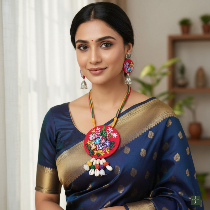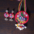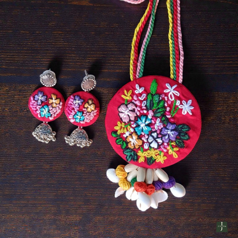 Necklace: A Round pendant made of Red fabric base with colorful, intricate floral embroidery is attached to a braided cord neckpiece adorned with small fabric beads in green, red, grey, and white.