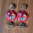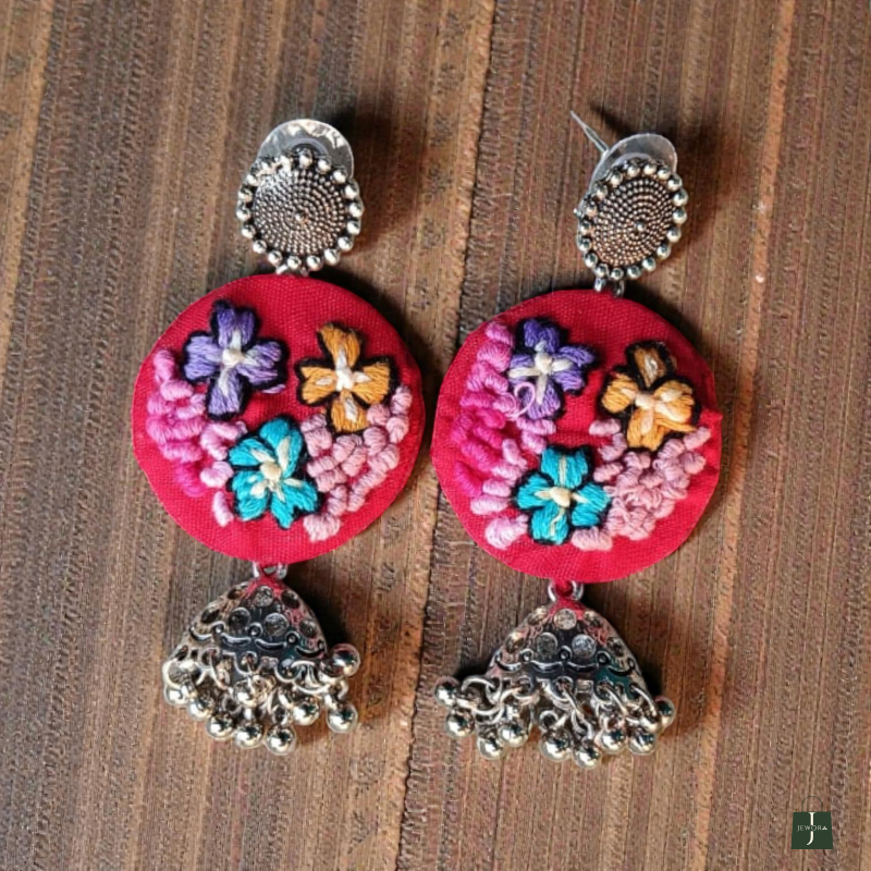 Earrings: A matching pair of dangling earrings features smaller, round pink fabric pieces with similar floral embroidery, suspended beneath ornate, silver-toned Jhumka-style metal components.
