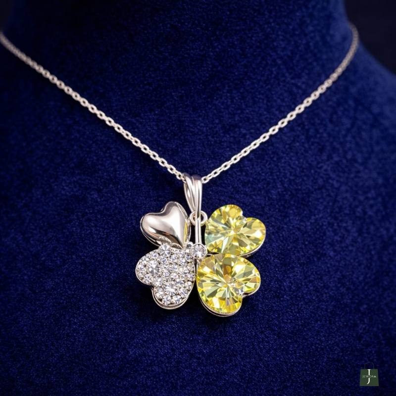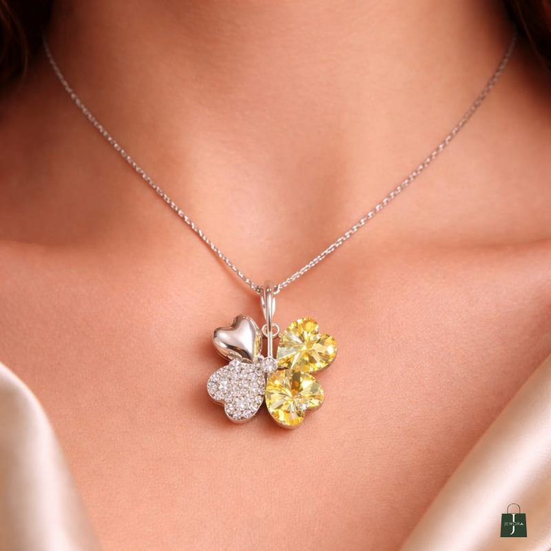 A stunning floral-inspired pendant featuring golden crystal hearts paired with shimmering silver accents. Designed to symbolize joy, love, and positivity, this piece adds a warm radiant glow to any look.