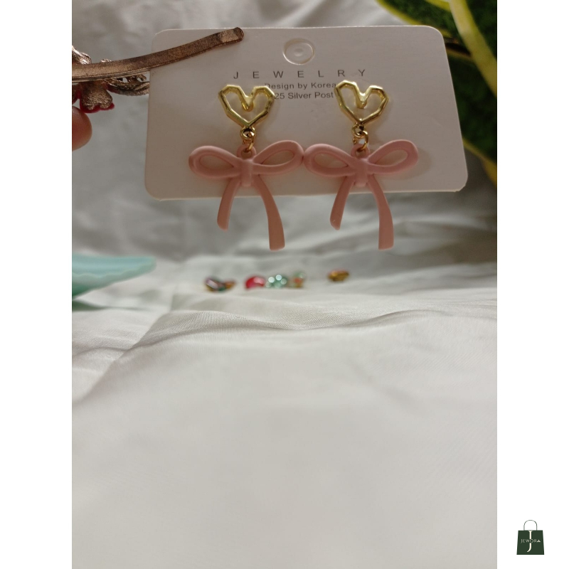Heart bow dangly earrings, also available in light green and light blue, yellow.