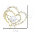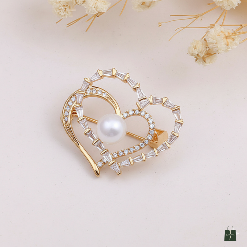 ELEGANT DESIGN: Heart-shaped brooch featuring lustrous pearl centre and sparkling crystal rhinestone accents in a sophisticated two-tone silver and gold finish