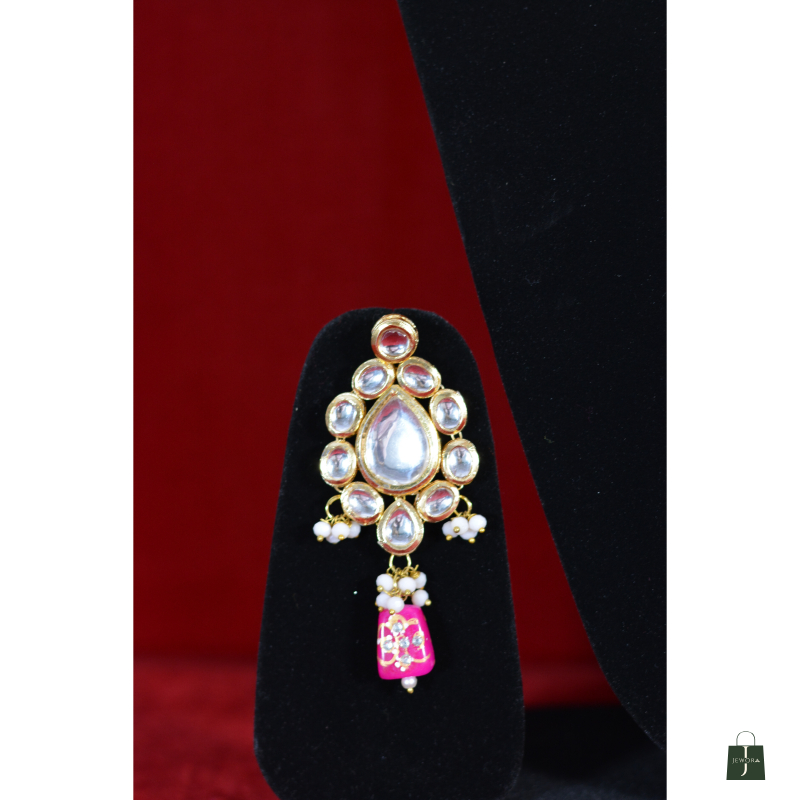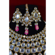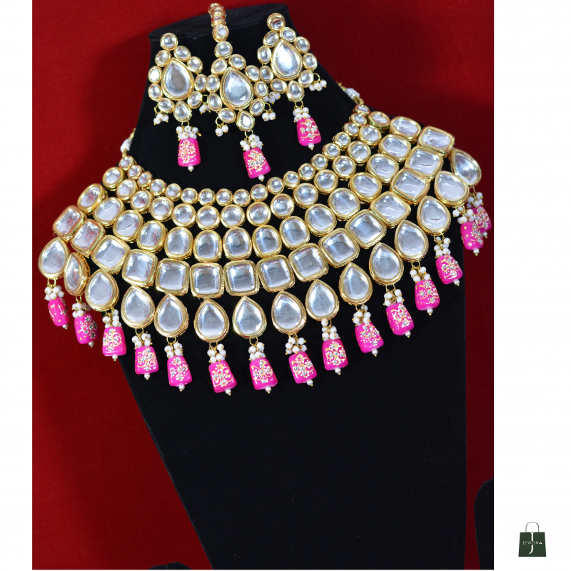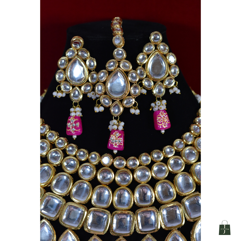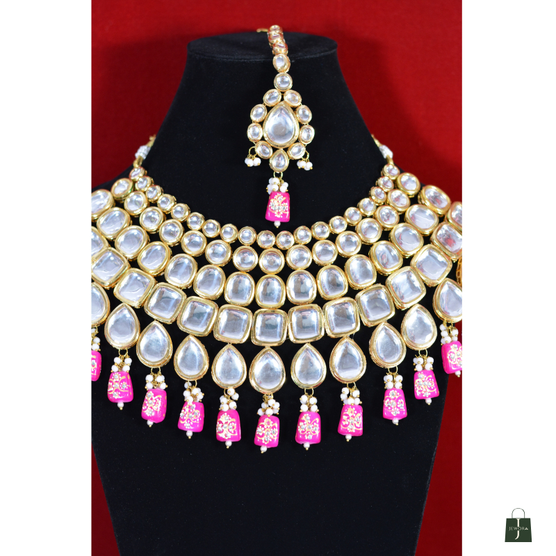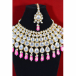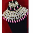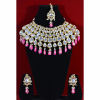 Heavy Bridal Kundan Necklace Set With Pink Bead Drops And Maangtika