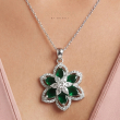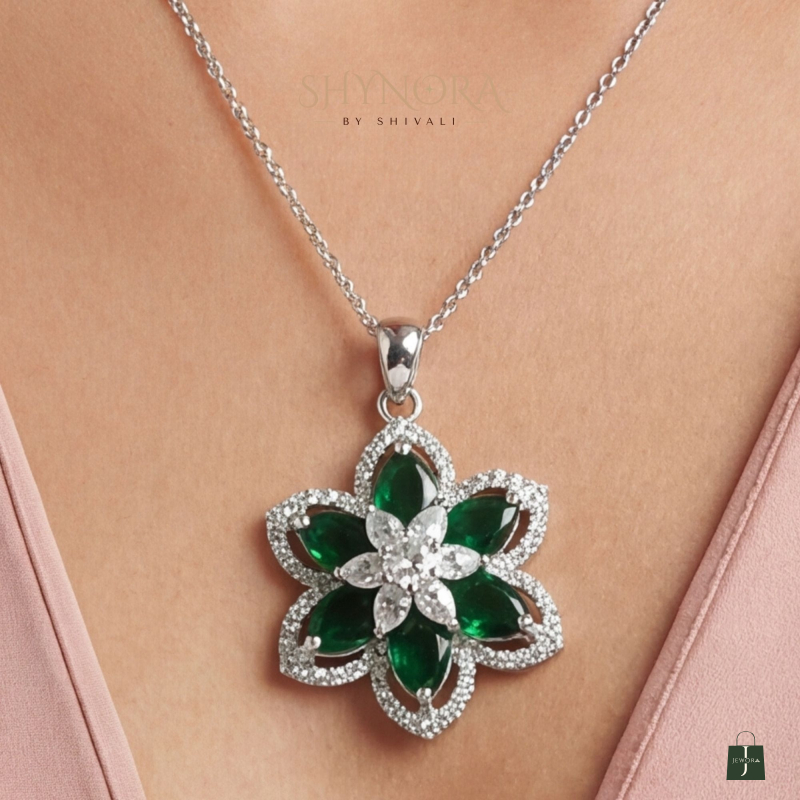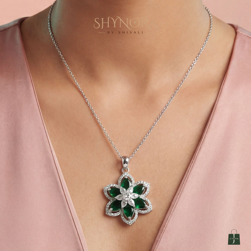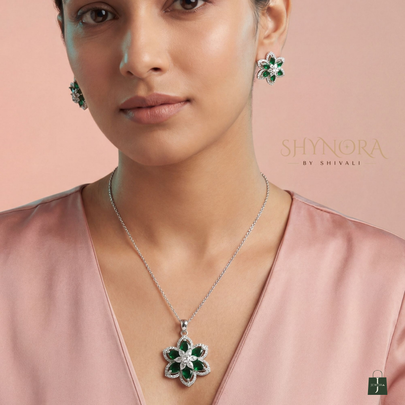 The Heer Emerald Bloom AD Pendant Set showcases a graceful floral design highlighted with rich emerald green stones and sparkling American Diamonds. The flower-inspired pendant is beautifully paired with matching stud earrings, creating a timeless and elegant look.