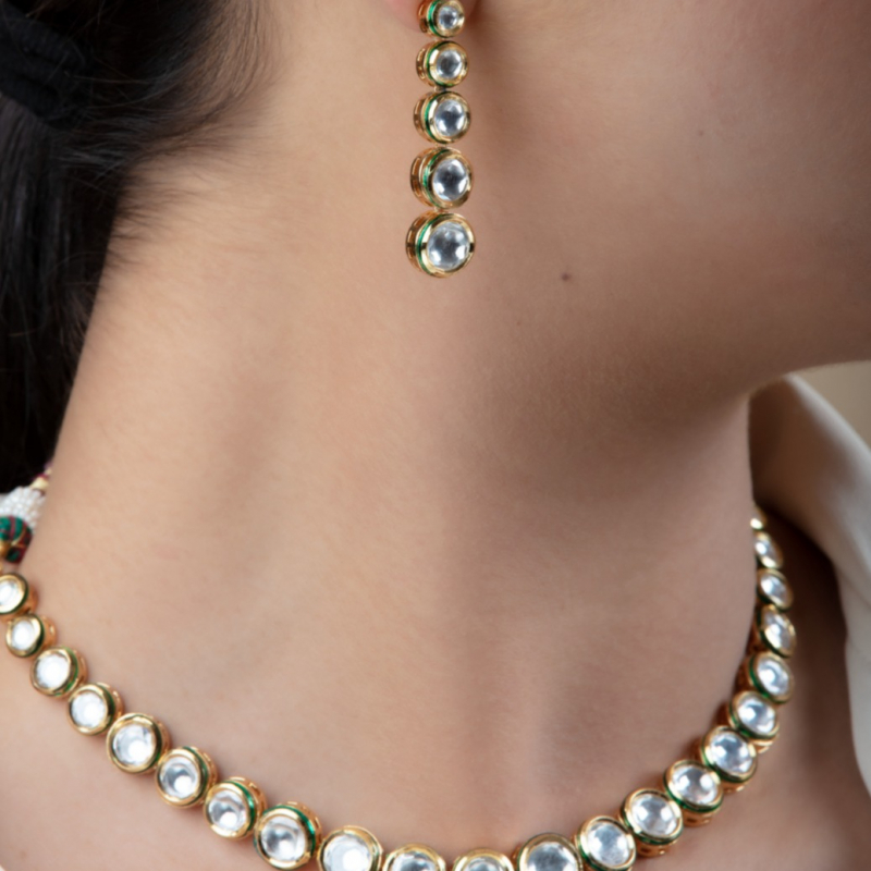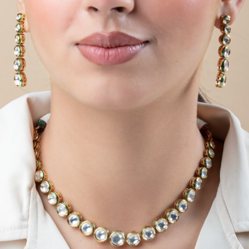 Enhance your look with this sophisticated necklace set, perfect for both traditional and modern occasions.✨ Choker-style necklace – A sleek row of finely crafted Kundan stones set in a gold-toned base for a timeless appeal.