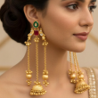 Crafted to make an entrance, the Heer Kashmiri Jhumka Danglers are a celebration of traditional artistry blended with bold elegance. Featuring a striking green teardrop kundan at the top, a ruby-toned square centerpiece, and ornate gold motifs, these earrings flow into triple cascading chains finished with a detailed jhumka drop.