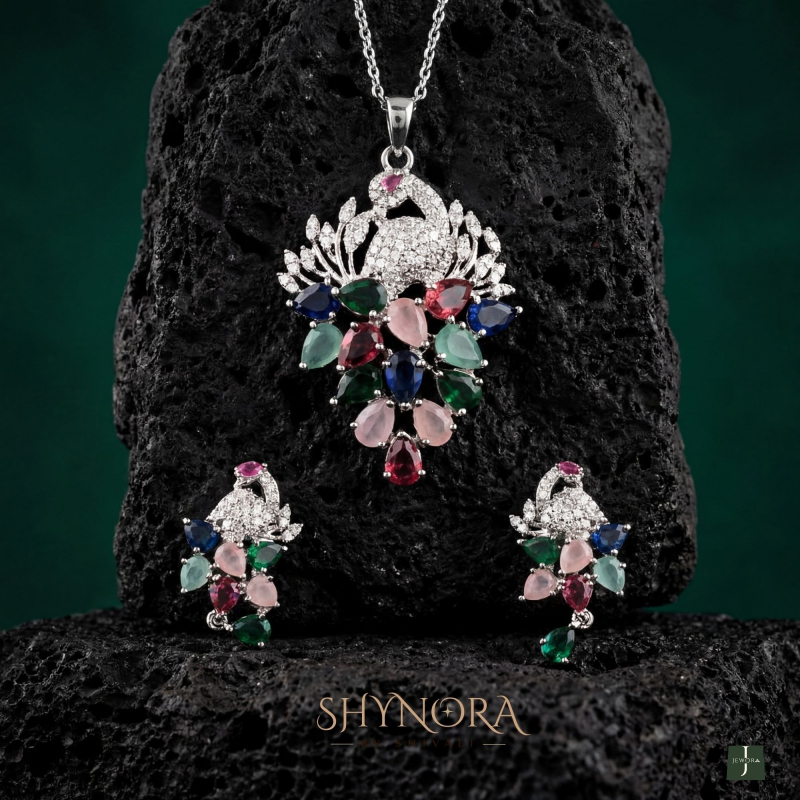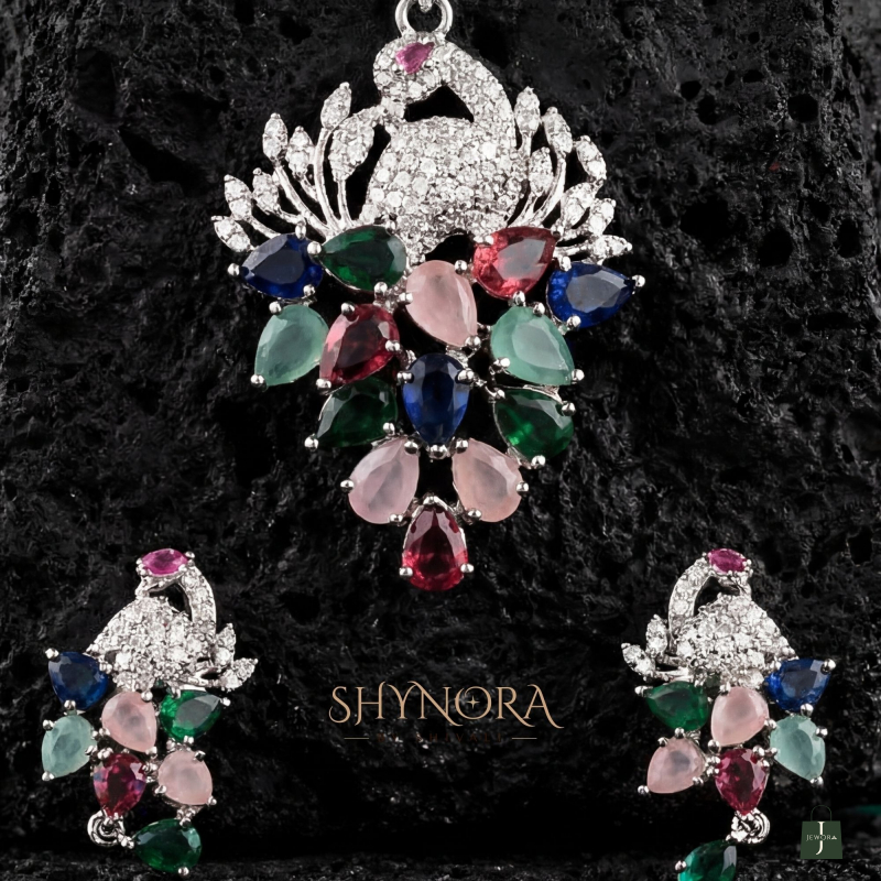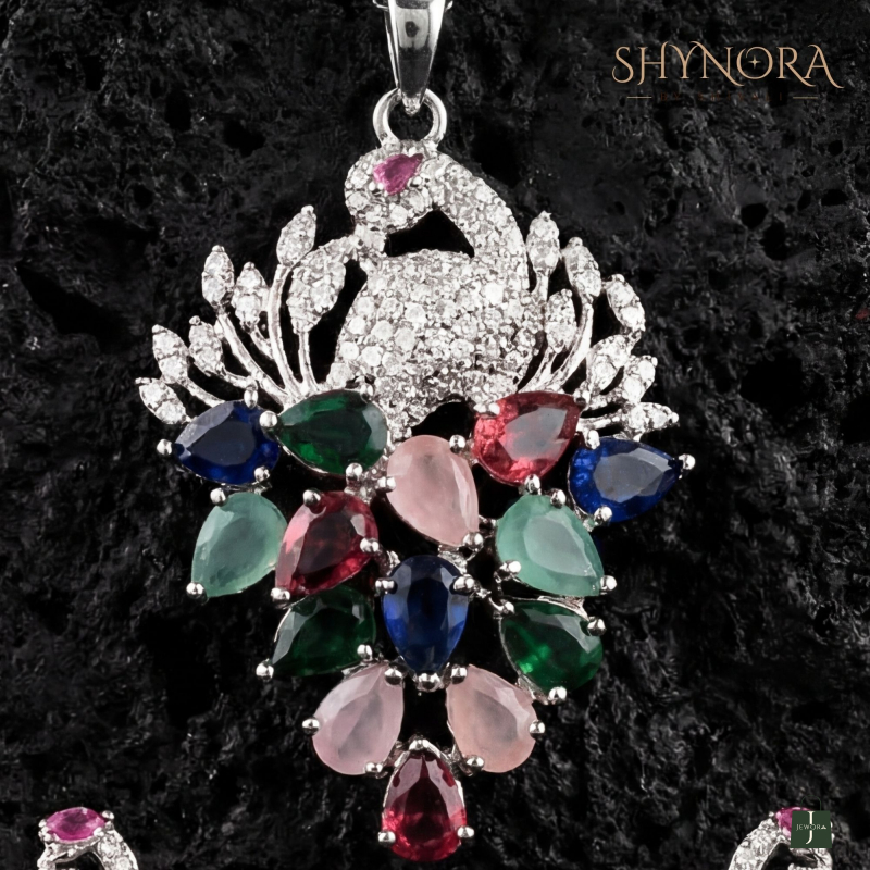 The pendant is paired with matching drop earrings, designed to complement the flowing peacock pattern and enhance the overall sparkle. This multicolor design makes the set extremely versatile—easy to pair with both traditional and contemporary outfits.