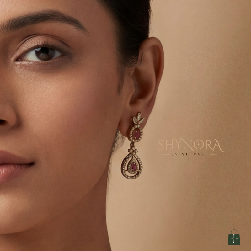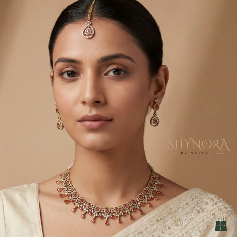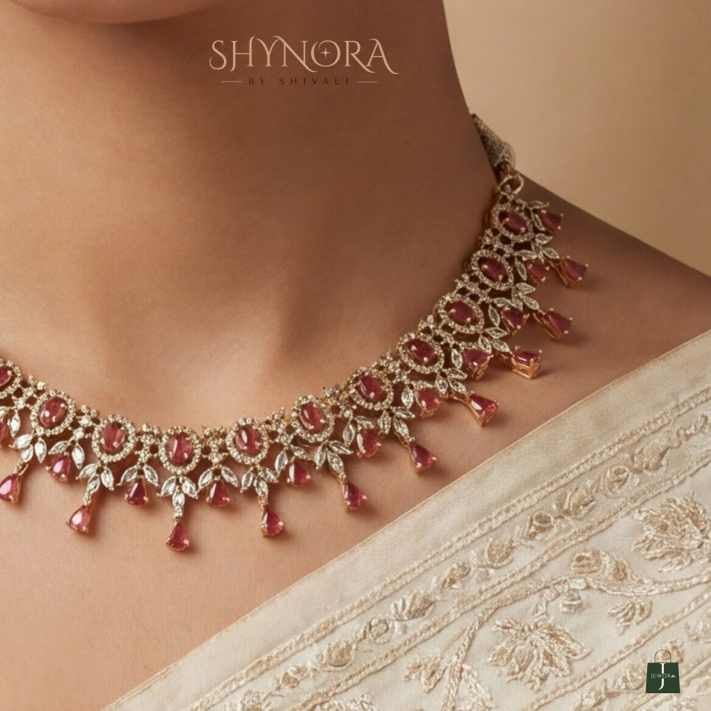 The Heer Ruby Hanging Drops AD Necklace Set showcases timeless elegance with its beautifully crafted close-neck design, adorned with sparkling ruby red AD stones and delicate hanging drop details that add graceful movement and charm.