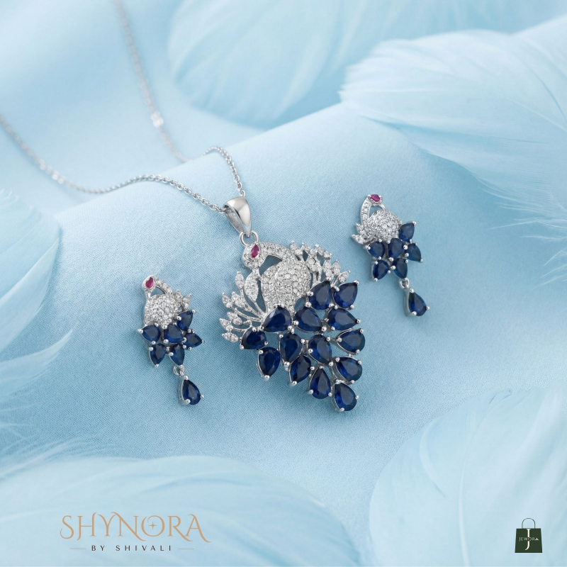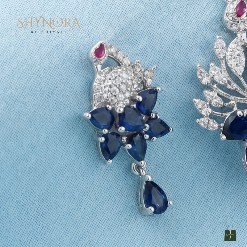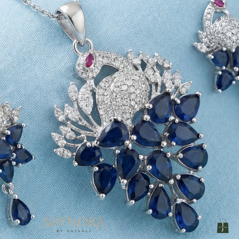 The Heer Sapphire Peacock Drops AD Pendant Set showcases timeless elegance with a regal peacock-inspired design. The pendant features a delicately crafted peacock motif encrusted with shimmering American Diamonds, beautifully accented with rich deep sapphire blue drop stones arranged in a graceful cascading pattern.