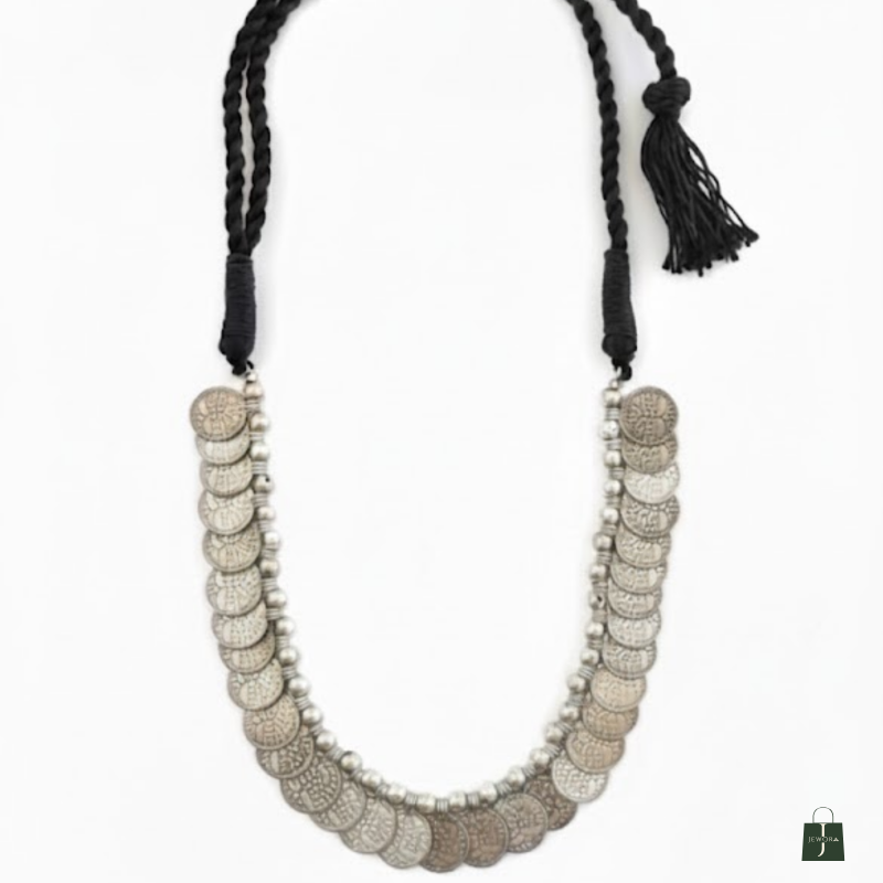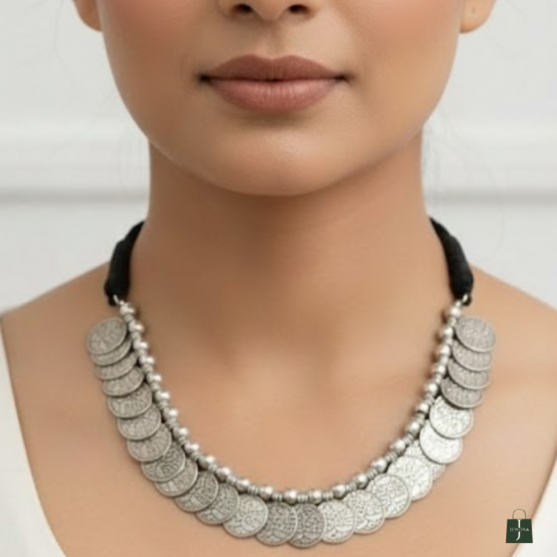A beautifully handcrafted oxidised silver coin necklace that blends ethnic charm with everyday elegance. Perfect for girls and women who love timeless, statement-worthy jewellery.