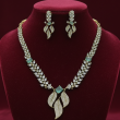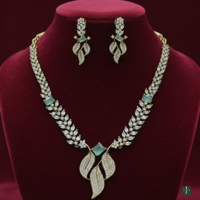 Elevate your evening attire with this sophisticated Ethereal Mint & Marquise Crystal Suite, a perfect blend of contemporary design and nature-inspired elegance. This set features a delicate gold-toned chain adorned with shimmering marquise-cut crystals that lead to a stunning trio of textured leaf pendants. Strategically placed seafoam-green stones add a refreshing pop of color, creating a serene and luxurious aesthetic.