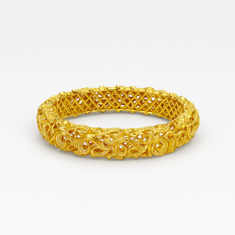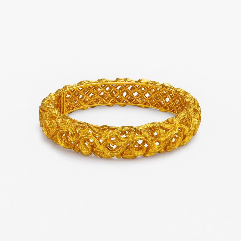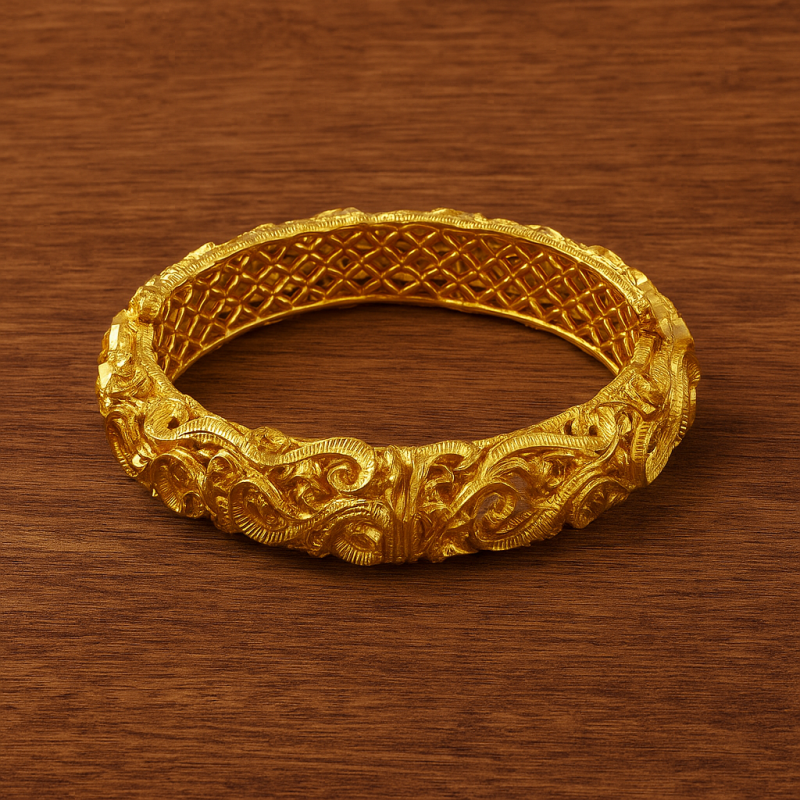 Heritage Floral Carved Kada Bangle showcases the grandeur of traditional Indian craftsmanship. Featuring intricate floral carvings in a gold-toned finish, this kada reflects timeless artistry with a bold and elegant touch. The wide band design highlights delicate detailing, making it the perfect accessory to elevate festive and traditional outfits.