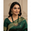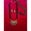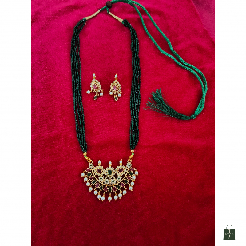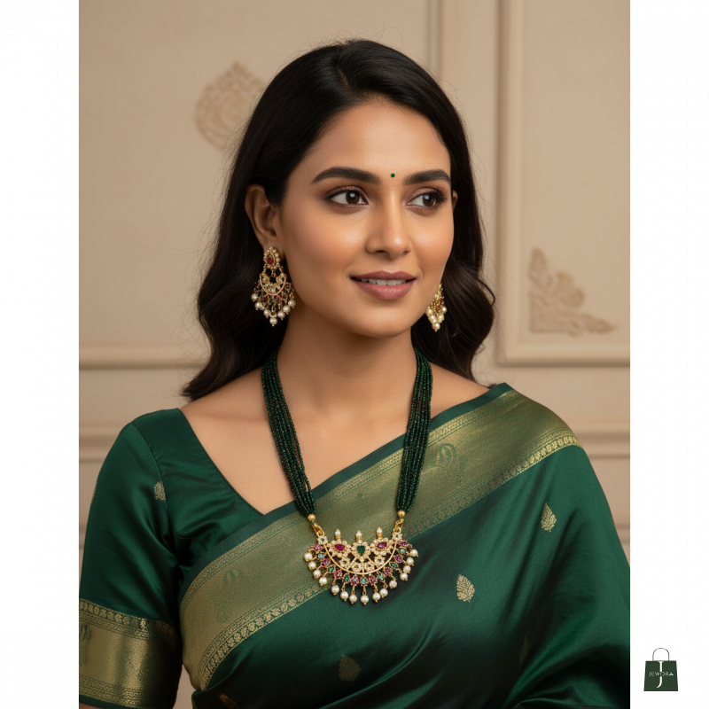 This stunning heritage-inspired necklace set features multiple strands of deep green beads paired with an exquisitely crafted Kundan pendant. The pendant showcases intricate gold detailing highlighted with ruby-toned stones and finished with elegant pearl drops for a rich, traditional look. Paired with matching chandelier-style earrings, this set adds regal charm to bridal and festive attire. Perfect for weddings, cultural celebrations, and grand occasions, it beautifully blends timeless artistry with luxurious elegance.