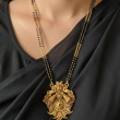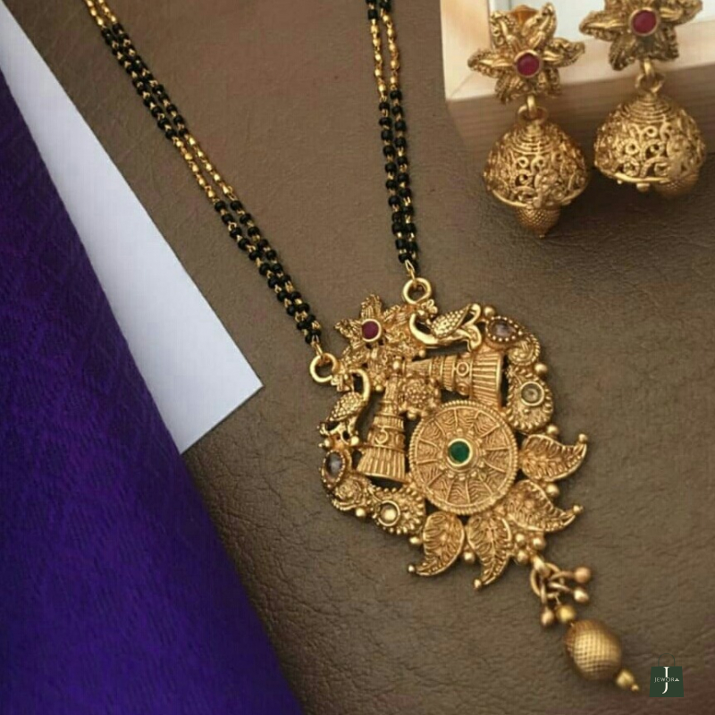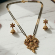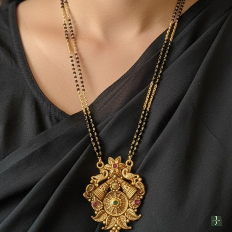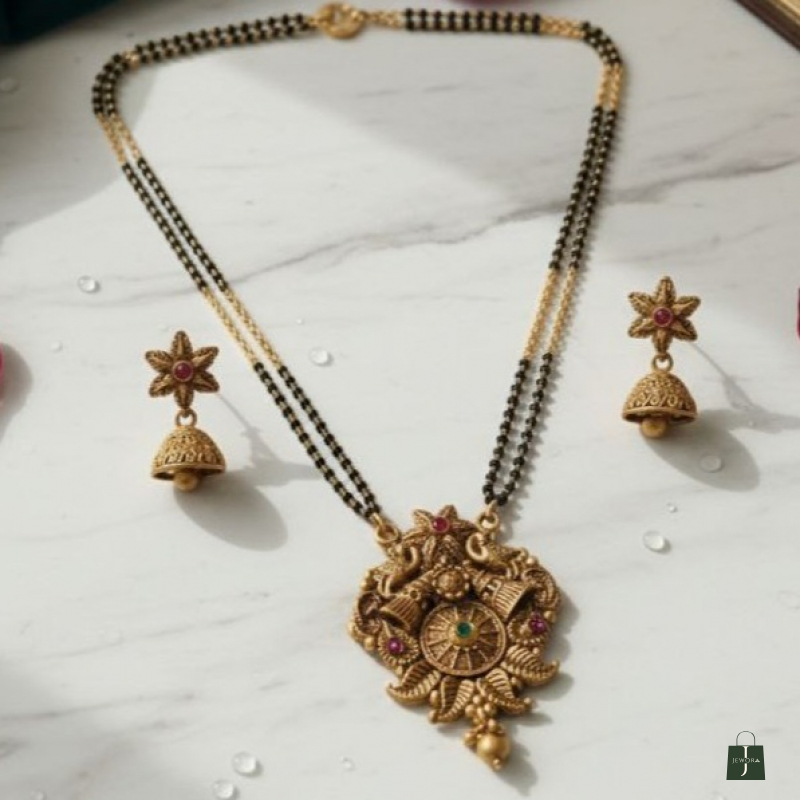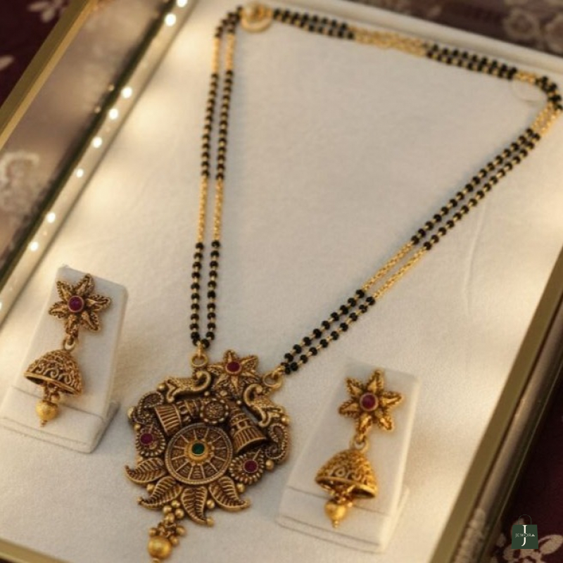 The Heritage Mandala Mangalsutra Necklace Set is a richly detailed temple-inspired jewellery piece that reflects India’s traditional craftsmanship. The large circular mandala pendant is adorned with intricate motifs of birds, floral carvings, and sacred patterns, symbolizing harmony and prosperity. The double-line black beaded chain gives it the classic mangalsutra look, while the matching floral jhumka earrings complete the royal ethnic appeal.