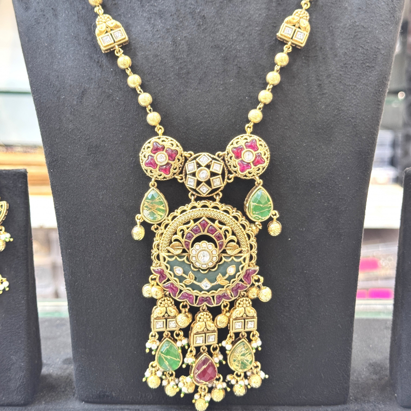 Elevate your festive and bridal look with the Heritage Meenakari Temple Haar by Jewora, a masterpiece that blends artistry with tradition. This opulent haar features intricate meenakari enamel work in rich shades of green, red, and white, highlighted with kundan settings and golden beads. The central pendant is adorned with traditional temple-inspired motifs, layered with pearls and hanging embellishments that add regal charm. Matching earrings complete the set, featuring delicate meenakari and jhumka-style drops.