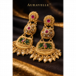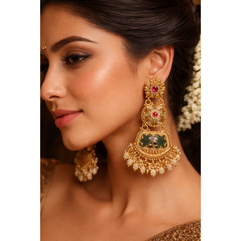 Add a touch of royal elegance to your look with these intricately designed antique gold earrings. Crafted with a stunning combination of ruby-toned stones and rich green onyx centerpiece, these earrings reflect timeless heritage artistry. The detailed floral motifs and delicate pearl hangings enhance their luxurious appeal, making them perfect for weddings, festive occasions, and ethnic celebrations.