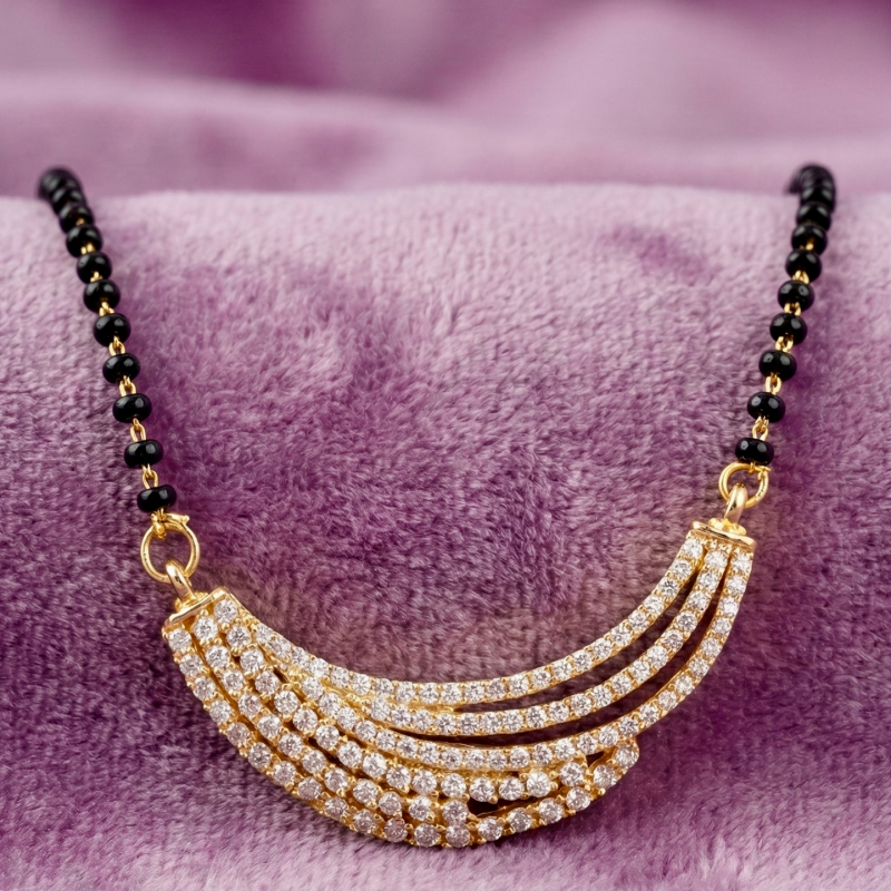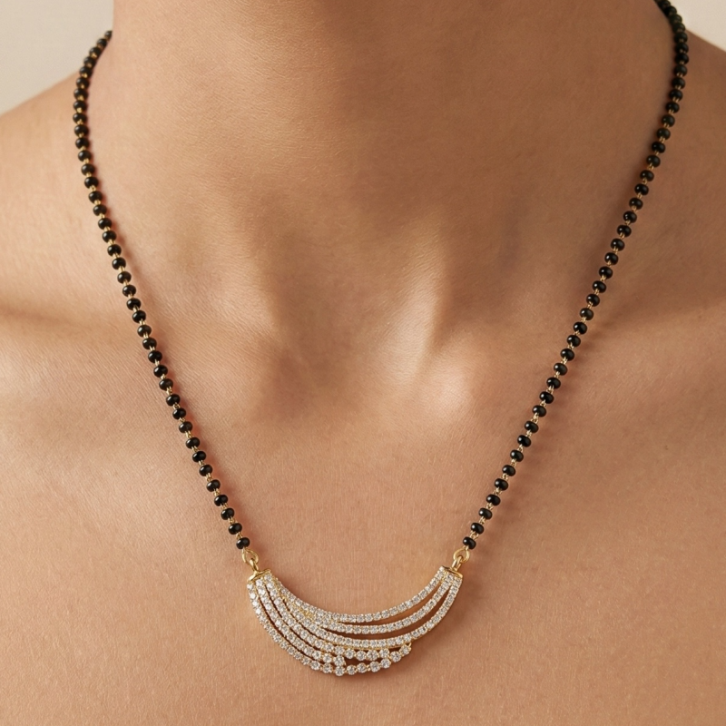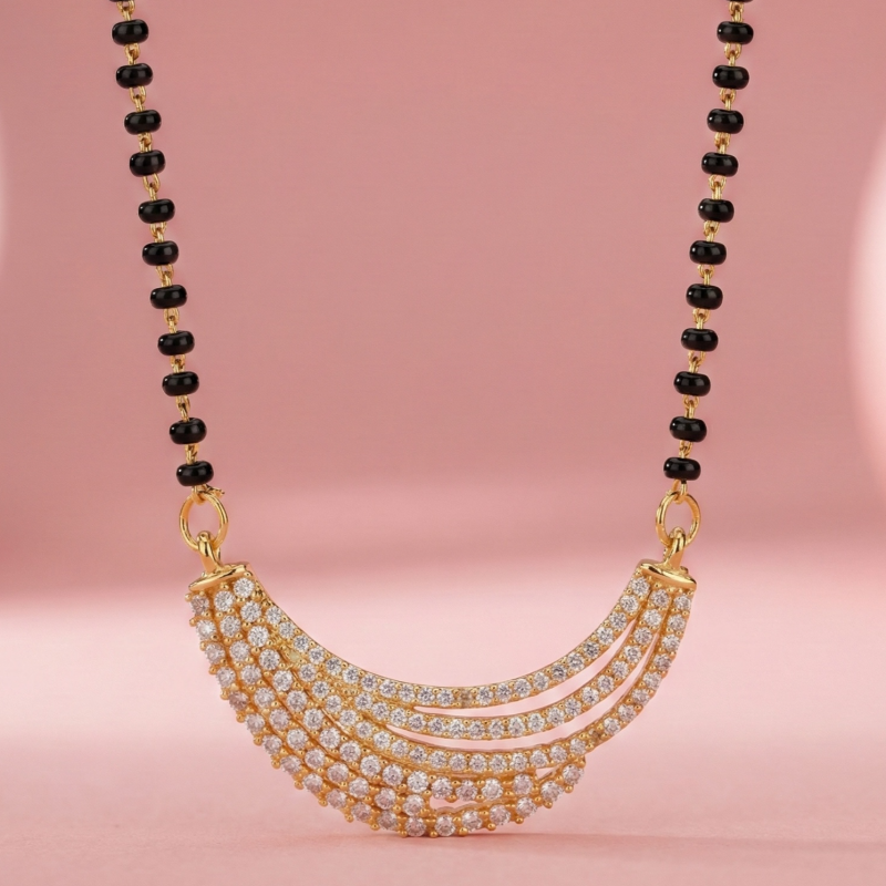 Hridaya Bandhan is a heartfelt symbol of love that connects two hearts. The black beads stand for protection and strength, while the shimmering American diamonds bring elegance and positivity. Crafted with premium gold polish, this mangalsutra is a meaningful expression of marital vows, designed for everyday grace.