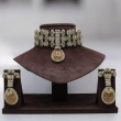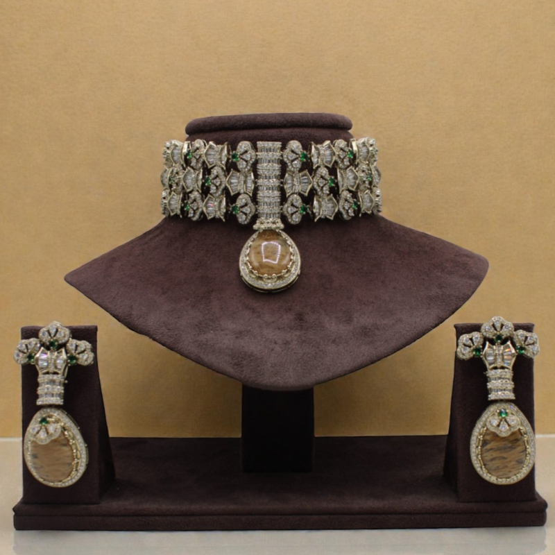The matching drop earrings mirror the choker’s detailed craftsmanship with a coordinated top motif and a large oval marble-finish drop, creating a complete bridal and occasion-ready ensemble.