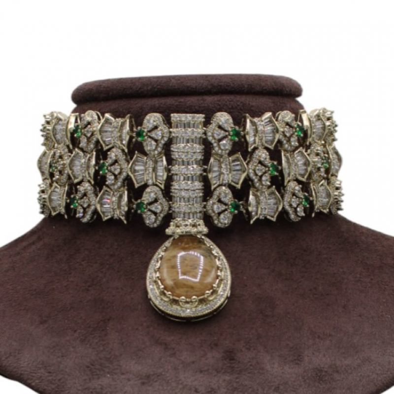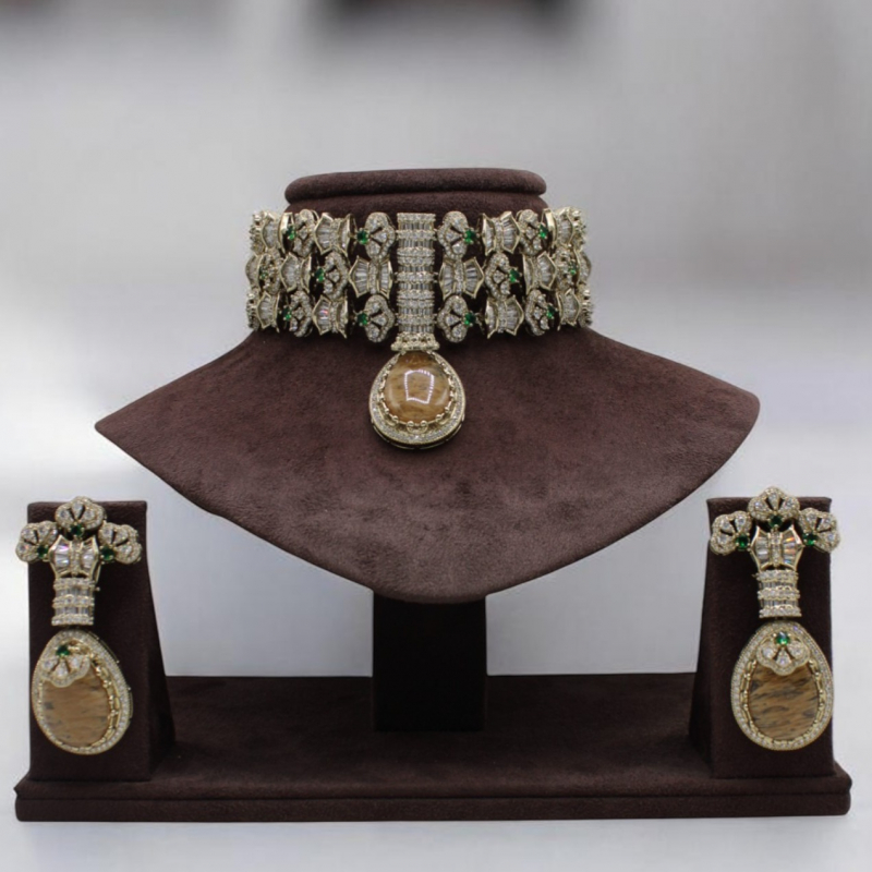 The necklace is highlighted with subtle emerald green accent stones that enhance its regal appeal. At the center, a bold round pendant with a marble-finish golden-beige stone is encased in shimmering micro-stone detailing, adding depth and grandeur to the overall look.