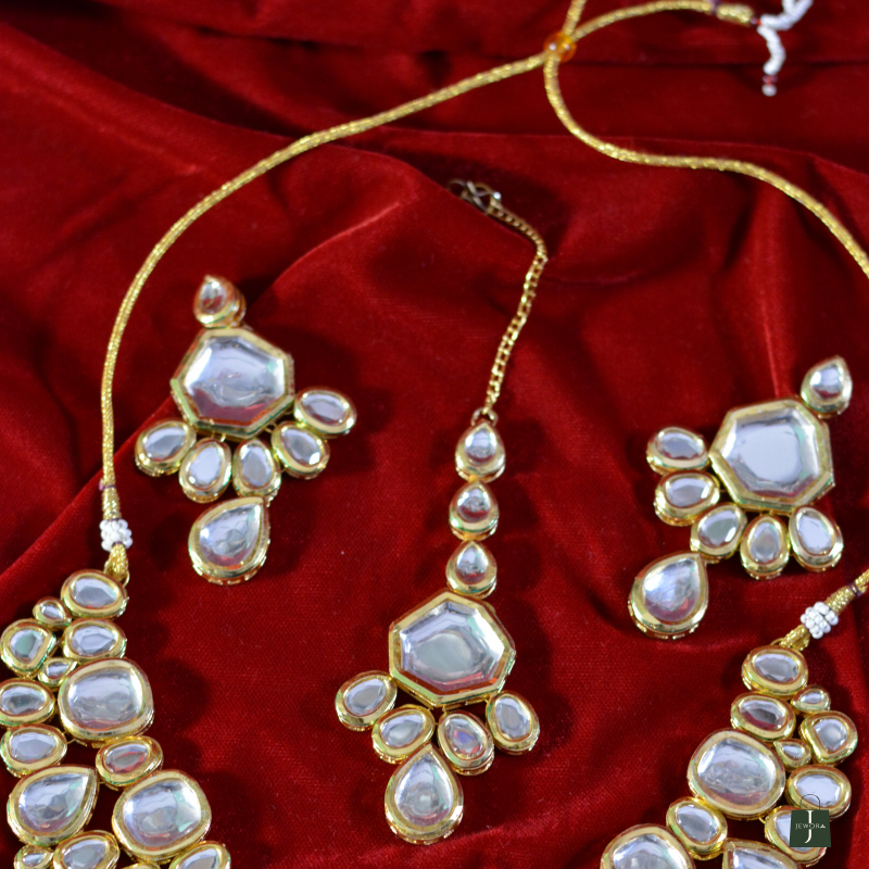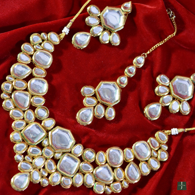Crafted to make an impact, this imperial Kundan multistone statement necklace set features bold stone placements and intricate detailing. The premium finish and traditional craftsmanship offer a royal look ideal for grand occasions, while its thoughtful construction ensures comfort and excellent value.