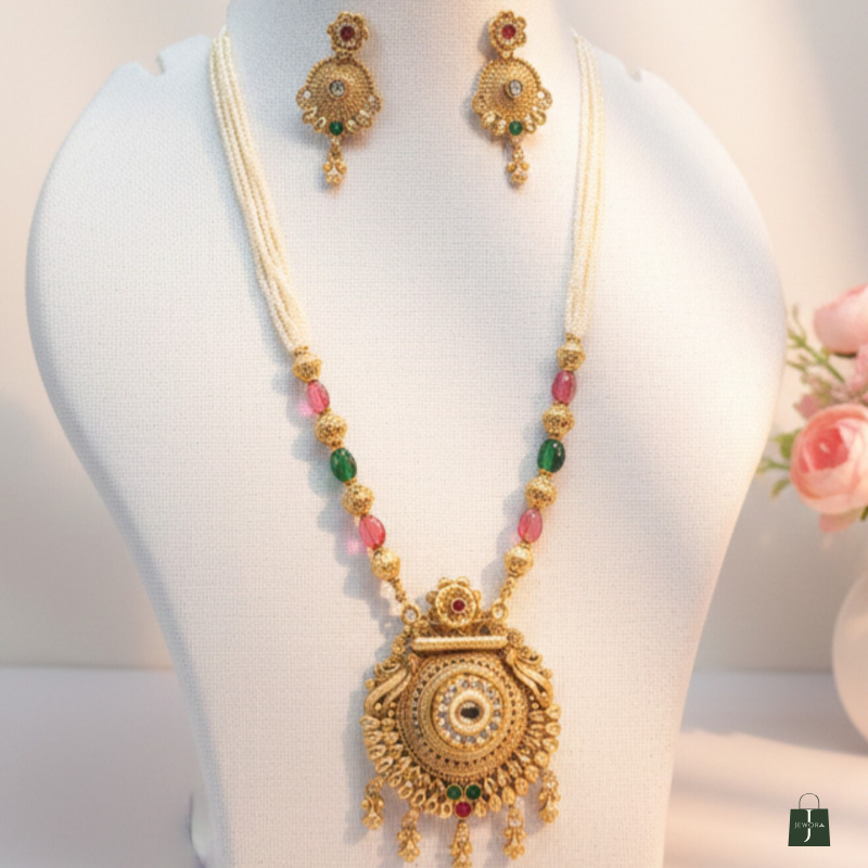 Embrace timeless grandeur with the Royal Chandrika Pearl Haram, a masterpiece of traditional artistry. This regal set features a multi-strand seed pearl chain accented with vibrant ruby and emerald-colored beads, leading to a magnificent circular sunburst medallion. Finished with intricate filigree and matching statement earrings, it is the ultimate heirloom for grand weddings and festive celebrations.