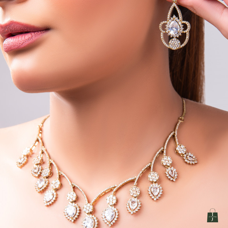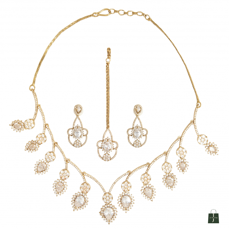 Elevate your festive and special-occasion look with the Inaya Cubic Zirconia Set. Expertly crafted with a silver vermeil and a subtle mehendi (Gold vermeil), this set radiates elegance and sophistication. Adorned with sparkling high-quality cubic zirconia stones, it captures light beautifully, adding a regal touch to any ethnic or party attire. A timeless accessory that seamlessly blends modern design with traditional charm.