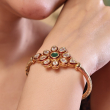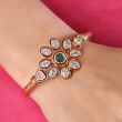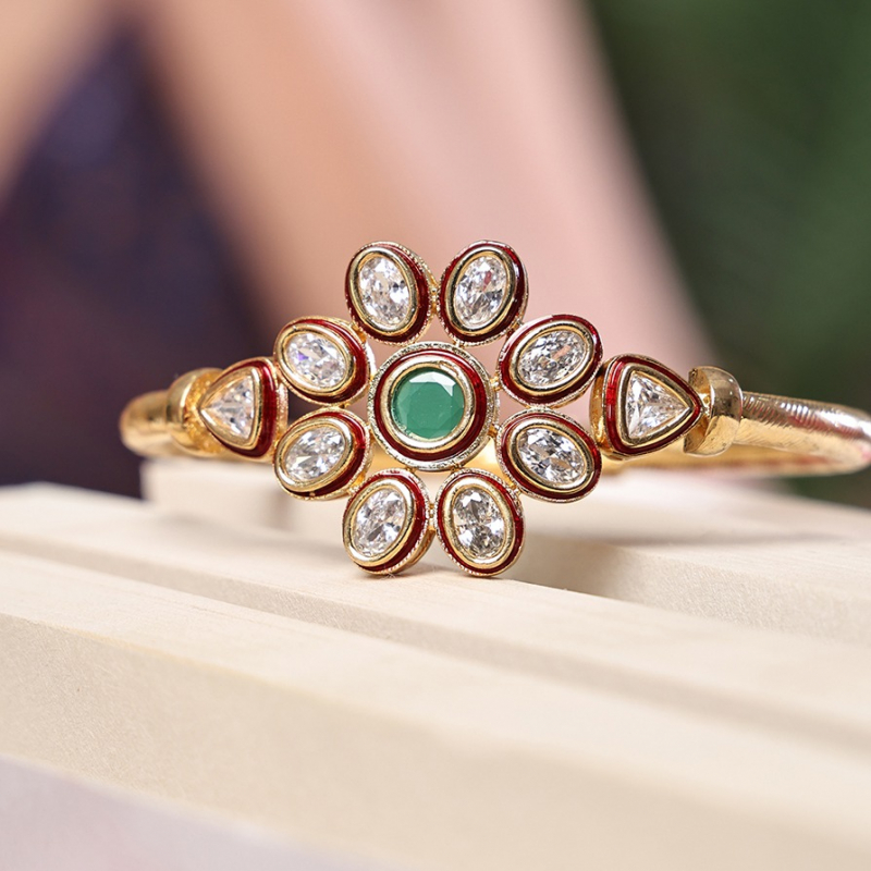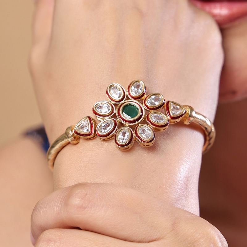 Enhance your elegance with this stunning floral kada bracelet, designed with a beautiful bloom motif at the center. Featuring a rich emerald-green stone surrounded by shimmering kundan petals, this piece radiates traditional charm with a modern touch. The red enamel outlining adds a vibrant contrast, while the gold polish elevates its luxurious appeal. Perfect for festive occasions, weddings, and ethnic styling, this bracelet is a timeless addition to your jewellery collection.