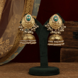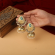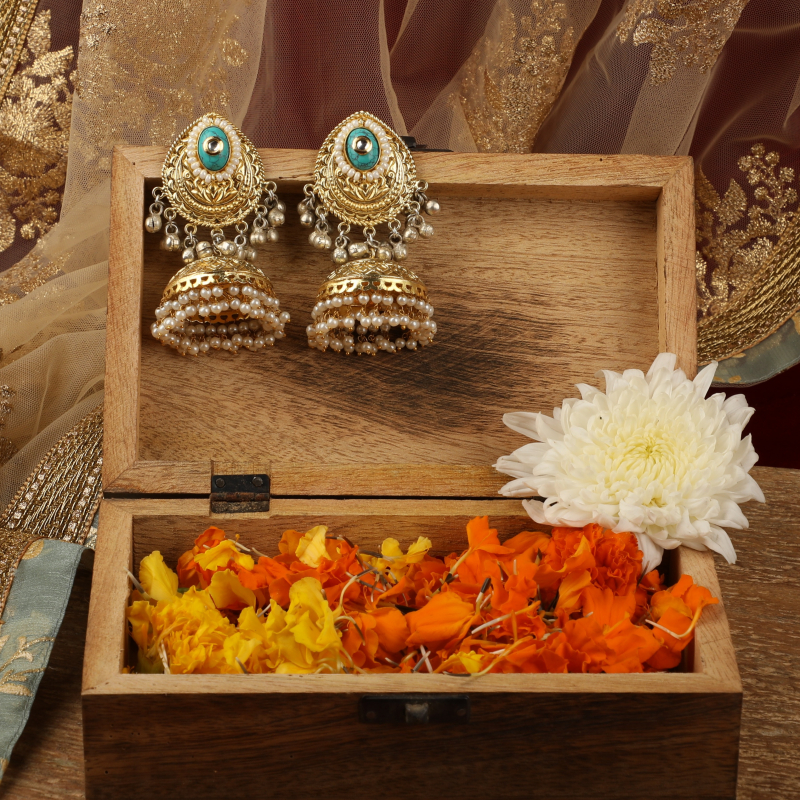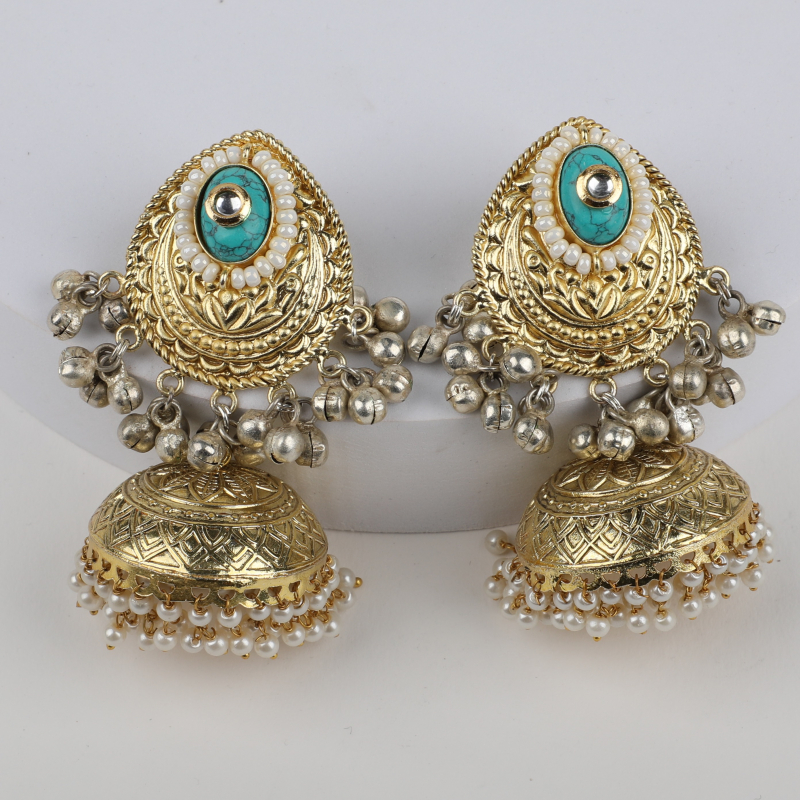 ooted in traditional craftsmanship, these ornate jhumka earrings exude vintage charm with a refreshing pop of colour. The upper stud features an intricately engraved gold-toned base, highlighted by a turquoise-hued oval stone encircled with delicate pearl detailing. Silver-toned ghungroo accents add texture and movement, creating a beautiful contrast against the antique gold finish.
