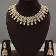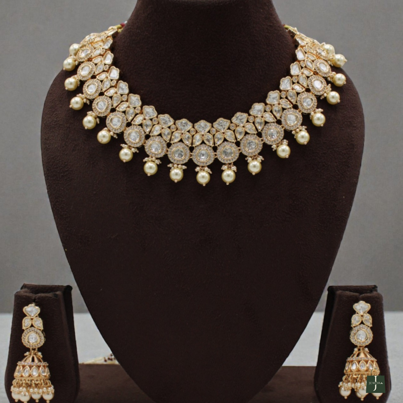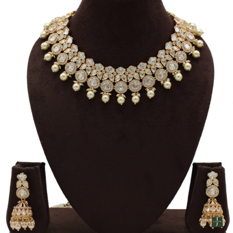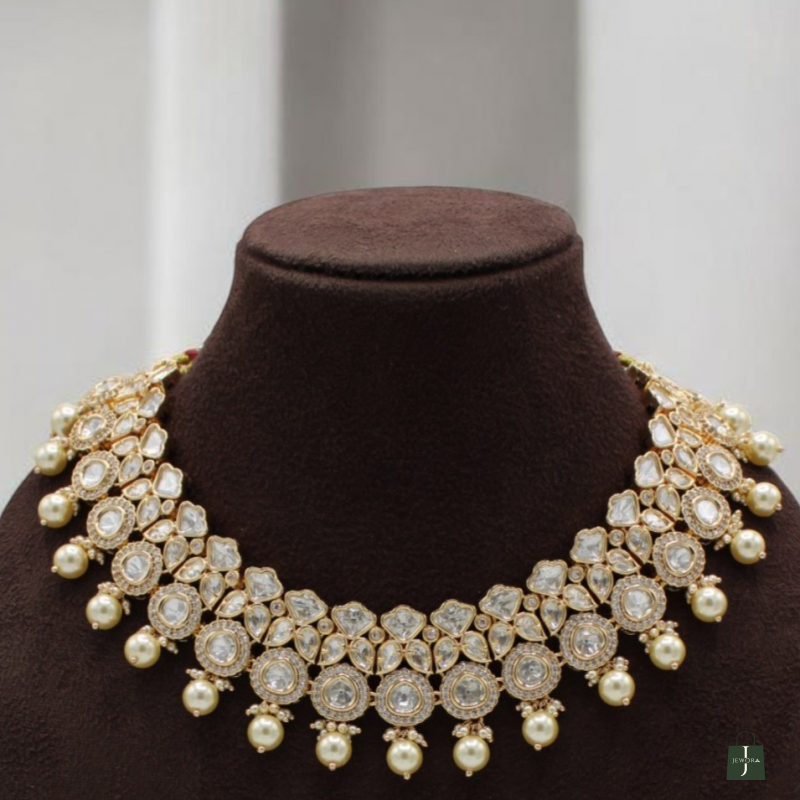Soft ivory pearl drops line the lower edge of the necklace, adding gentle movement and enhancing its elegance. The matching jhumka earrings complement the necklace perfectly with detailed stonework and pearl hangings, making this set ideal for weddings, receptions, and festive occasions.