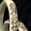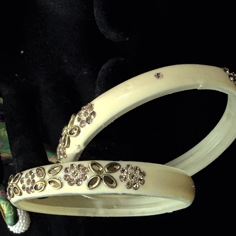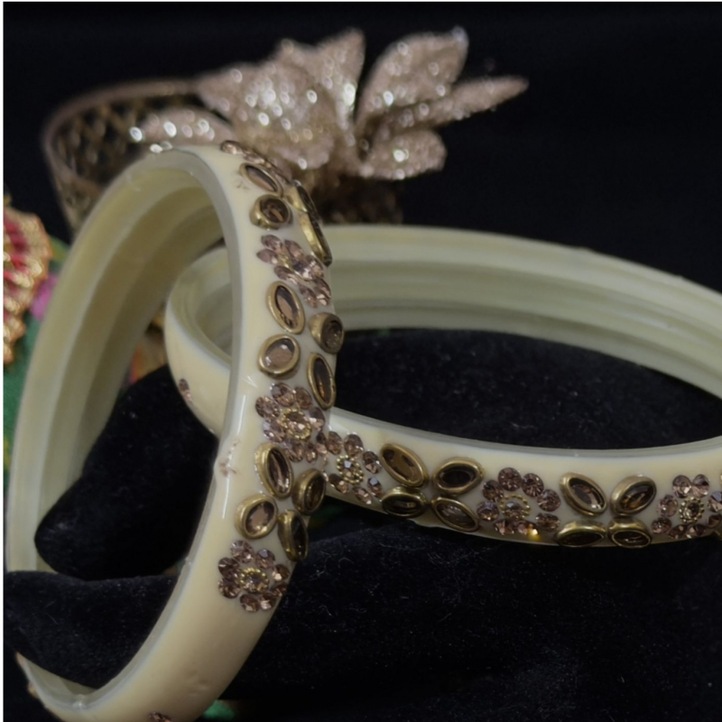 This graceful pair of ivory cream enamel bangles features intricate floral kundan work set in a rich gold polish. The soft, glossy ivory base beautifully complements the sparkle of champagne-toned stones arranged in floral and oval motifs. Perfect for weddings, festive occasions, and traditional outfits, these bangles add a subtle yet luxurious charm to your look.