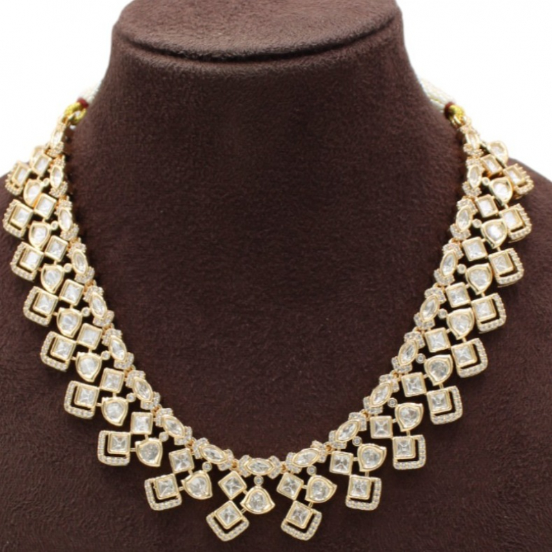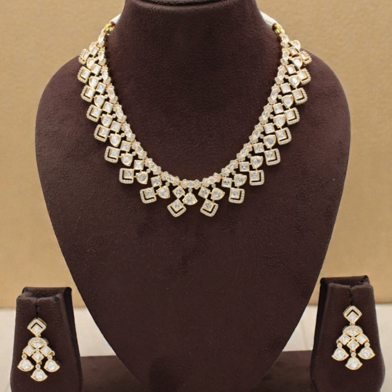 Elevate your ethnic elegance with this beautifully designed Ivory Gleam Kundan Necklace Set. Featuring a refined arrangement of square and teardrop-shaped white Kundan stones, this necklace creates a graceful cascading pattern along the neckline. The symmetrical geometric layout adds a modern touch while maintaining traditional charm.