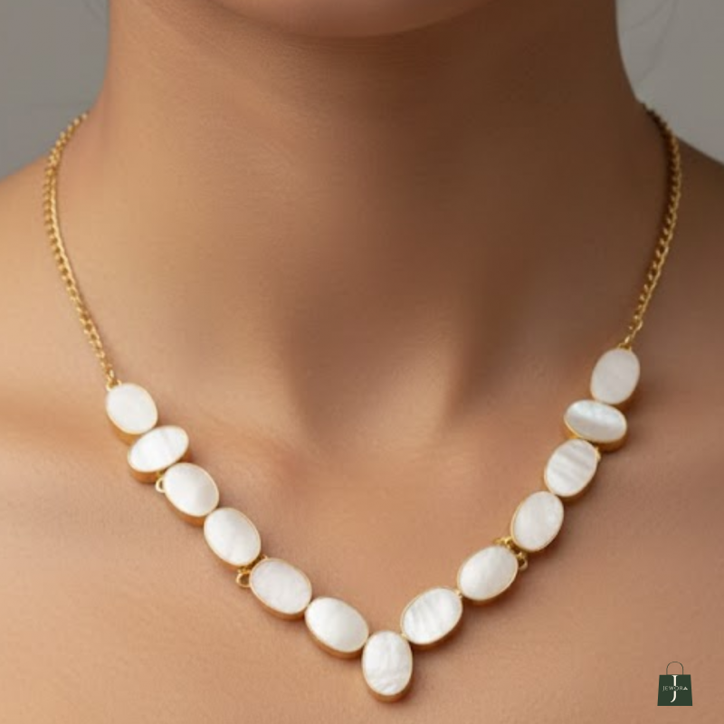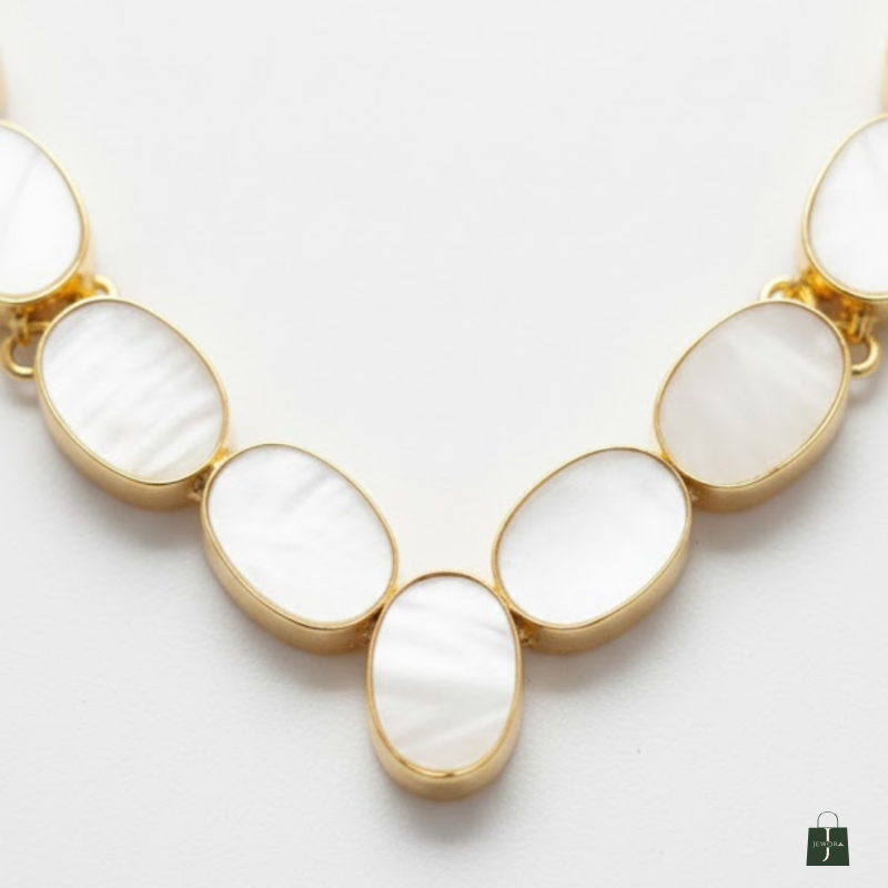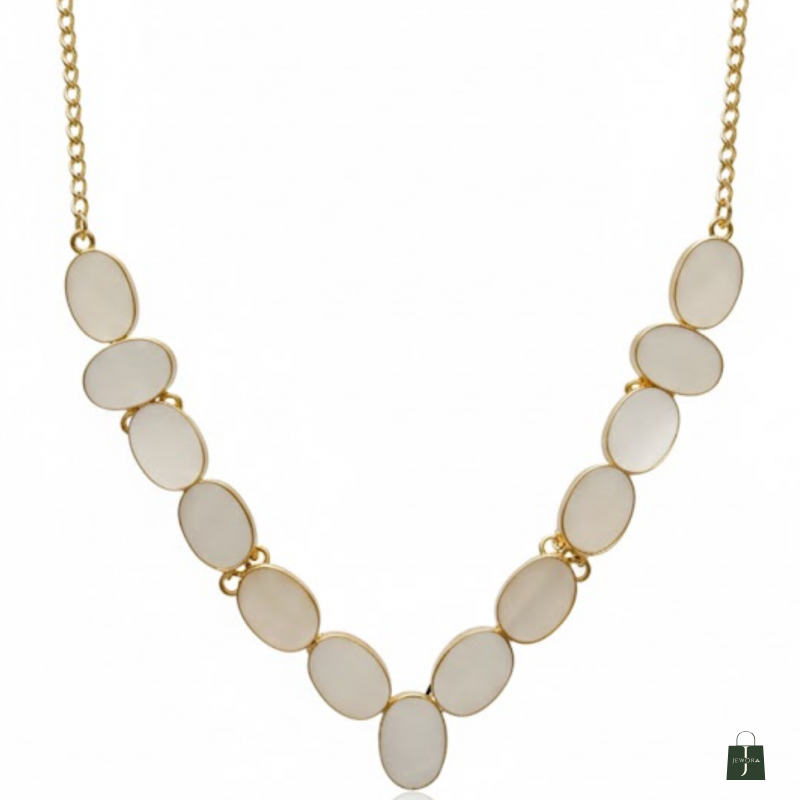 A sophisticated necklace crafted with glossy ivory oval charms set in a golden frame. Elegant, lightweight, and perfect for elevating both ethnic and western outfits.