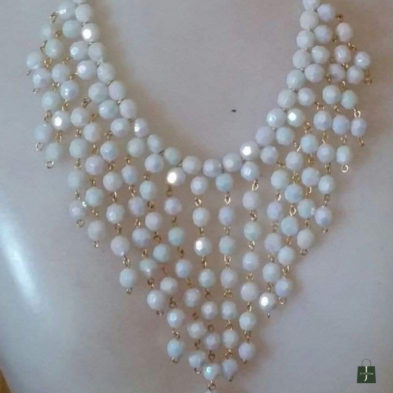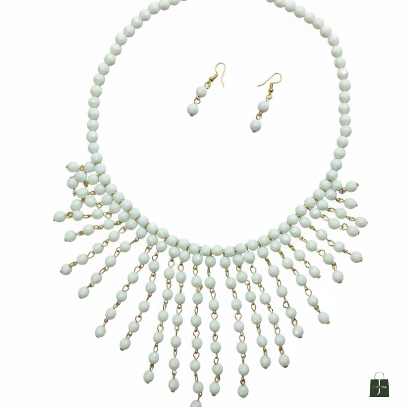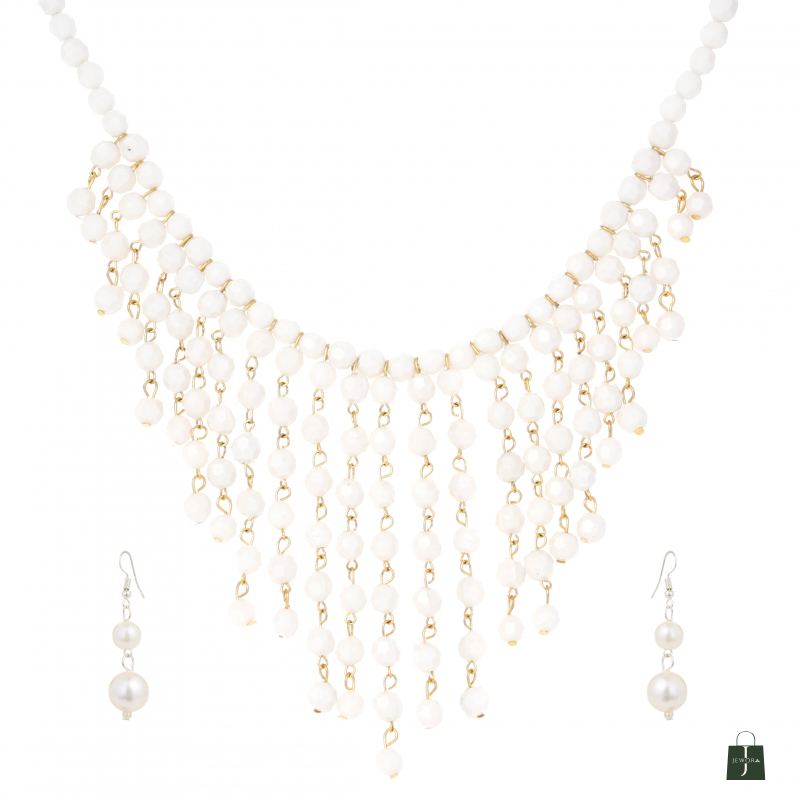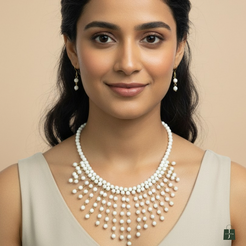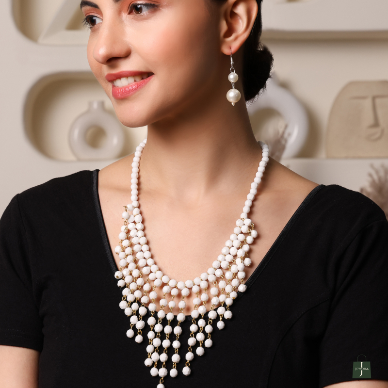 The Ivory Pearl Cascade Necklace Set is a stunning statement piece designed to add timeless elegance to any outfit. Crafted with high-quality synthetic ivory pearls, this necklace features a beautiful layered waterfall design that gracefully drapes along the neckline, creating a rich and luxurious look. The faceted pearl beads reflect light softly, giving a subtle glow and premium finish.