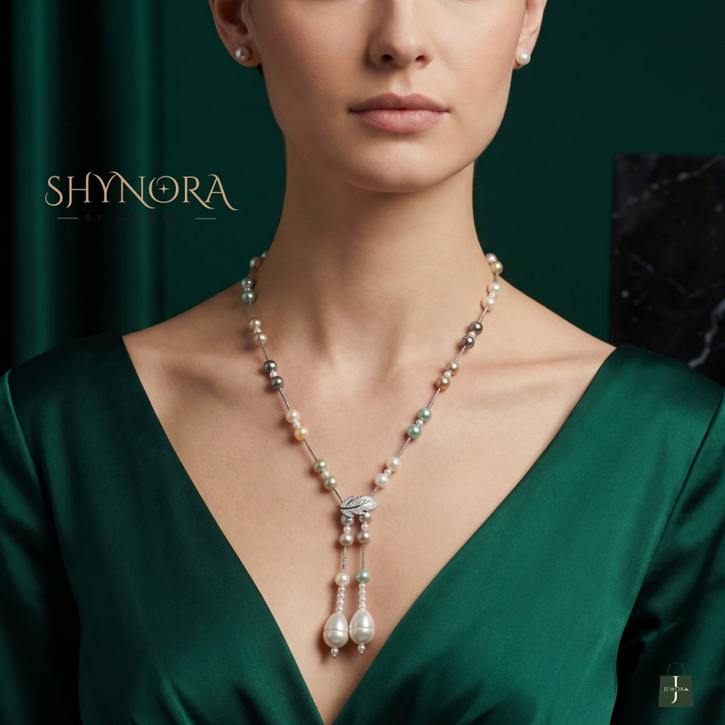 The Ivory Pearl Drop Mala is a long, graceful necklace crafted with alternating multi-toned pearls on a delicate chain. It features a refined leaf-inspired centre element that flows into twin pearl drops, creating a sophisticated and elongated silhouette.