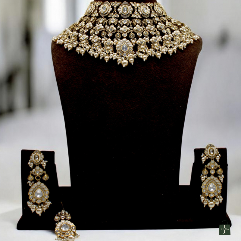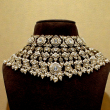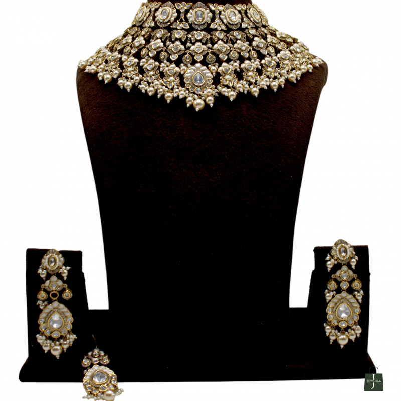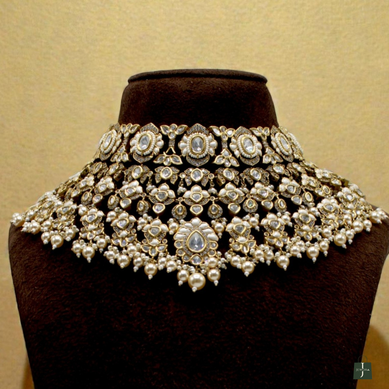 Elevate your bridal and festive look with this luxurious choker set designed with intricate detailing and rich pearl embellishments. The choker features multiple layers of finely arranged white kundan-style stones set in a dense, royal pattern, highlighted with delicate pearl drops along the edges.