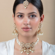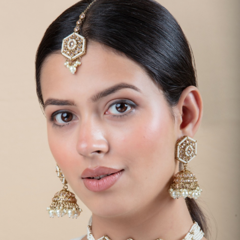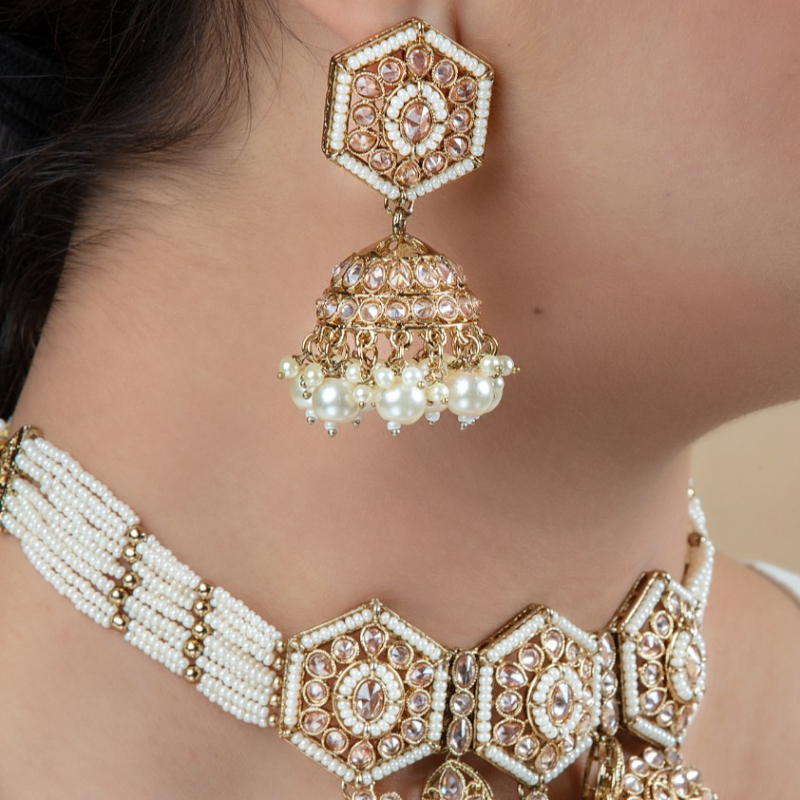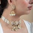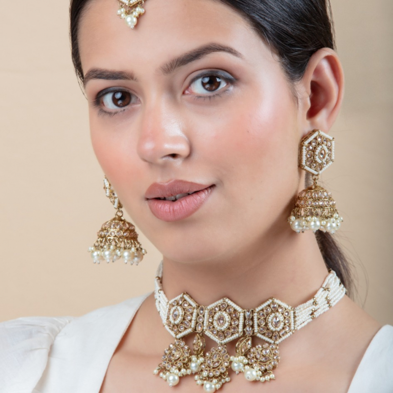 Step into timeless elegance with this beautifully crafted ivory pearl Kundan choker set. Designed with unique hexagonal motifs, the necklace is adorned with finely set Kundan stones and multiple layers of delicate pearl strings. The set is complemented by matching jhumka earrings and a graceful maang tikka, all finished with pearl danglings that add a touch of royal charm. Perfect for brides and festive occasions, this set blends traditional craftsmanship with a refined modern aesthetic.