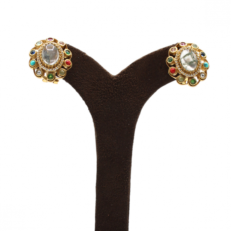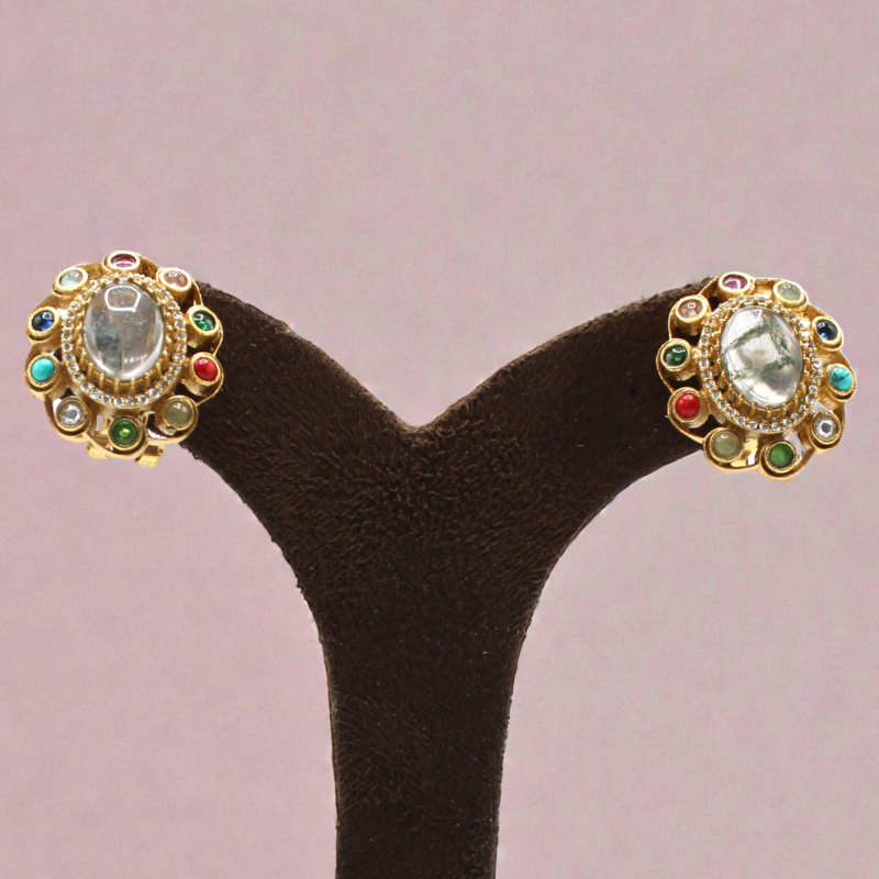 Timeless and regal, these Navratna royal stud earrings showcase a luminous oval ivory-toned polki-style center stone, encircled by a vibrant arrangement of multicolor stones. The intricate gold beaded detailing enhances the antique gold finish, giving the earrings a rich heritage appeal. The balanced combination of traditional navratna shades and classic polki design makes these studs perfect for festive wear, pooja ceremonies, weddings, and elegant ethnic styling. Compact yet luxurious, they are designed to elevate both simple and grand outfits.