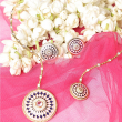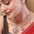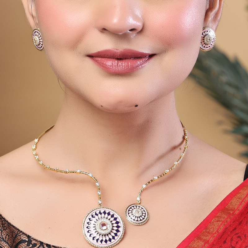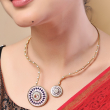 Elevate your elegance with the Ivory Radiance Medallion Necklace Set, designed to reflect timeless charm and modern sophistication. Featuring finely crafted circular pendants adorned with luminous white stones, this set beautifully blends minimal design with subtle sparkle. The delicate gold-toned chain is accented with shimmering stones, enhancing its graceful appeal. Perfect for both everyday wear and special occasions, this necklace set offers versatility and style in one. The matching stud earrings complete the look with a refined touch. Lightweight and comfortable, it sits gracefully on the neckline, making it an ideal choice for effortless elegance and understated glamour.