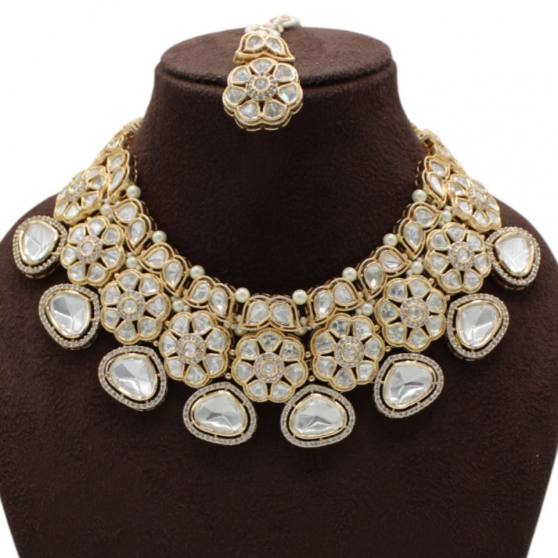 This elegant set includes matching earrings and a coordinating maang tikka, making it a perfect choice for brides, wedding ceremonies, receptions, and grand festive occasions.