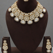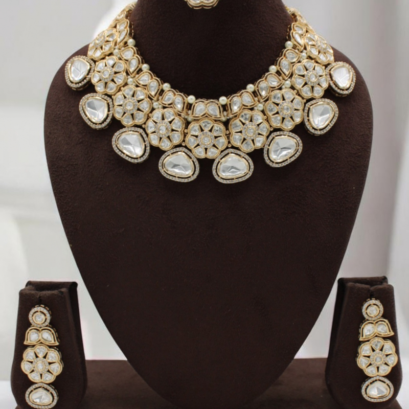 Make a majestic statement with this beautifully handcrafted Kundan bridal choker set. Designed with intricate floral motifs and framed teardrop-shaped stones, this piece reflects royal heritage craftsmanship. The choker is adorned with premium uncut ivory-toned stones, delicate pearl detailing, and a rich gold polish that enhances its luxurious appeal.