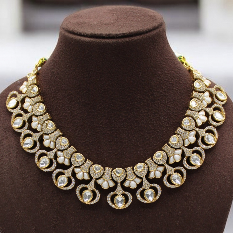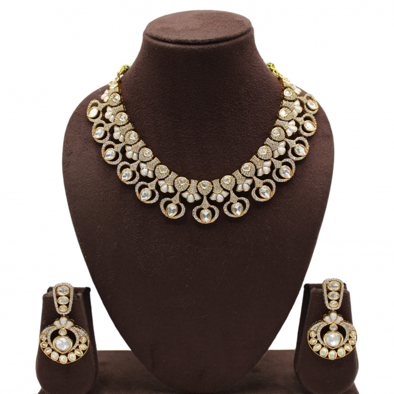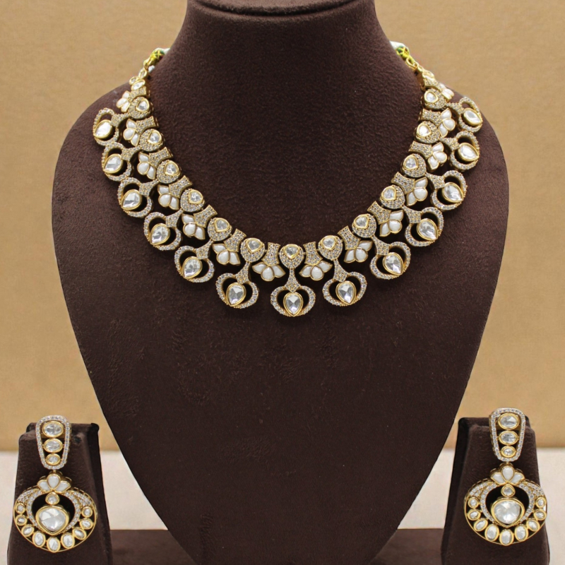 Add timeless grace to your festive collection with this beautifully designed ivory kundan-inspired necklace set. The necklace features a symmetrical arrangement of teardrop-shaped stones paired with delicate floral motifs, creating a rich and luxurious appearance. The matching drop earrings complete the look, making it perfect for weddings, receptions, festive occasions, and traditional celebrations. The intricate craftsmanship and detailed stone setting give this set a royal yet elegant finish.